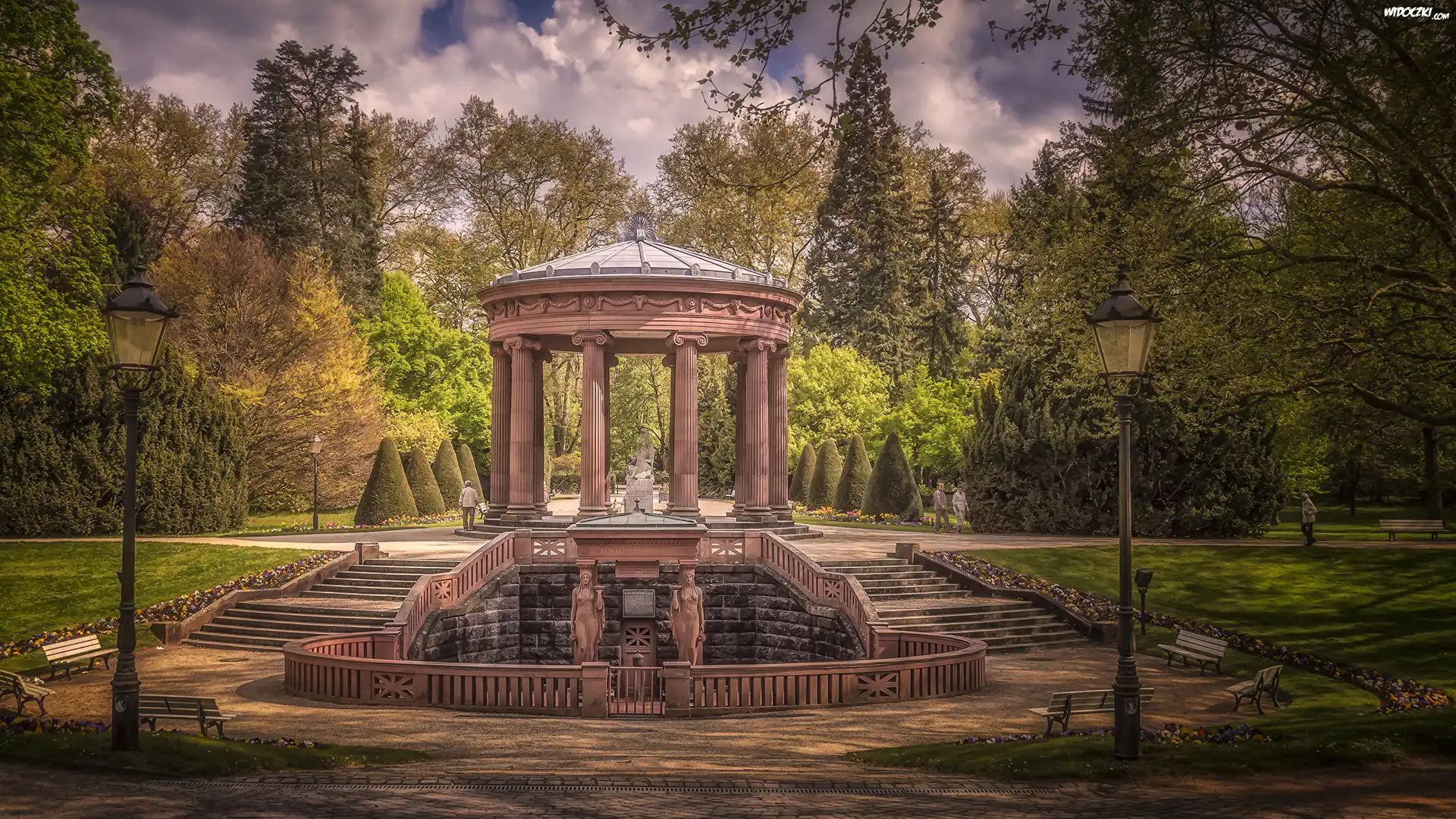 Park, Altana, Kolumnada, Schody, Latarnie, Ławki, Drzewa, Kwiaty, Chmury, Bad Homburg, Hesja, Niemcy |