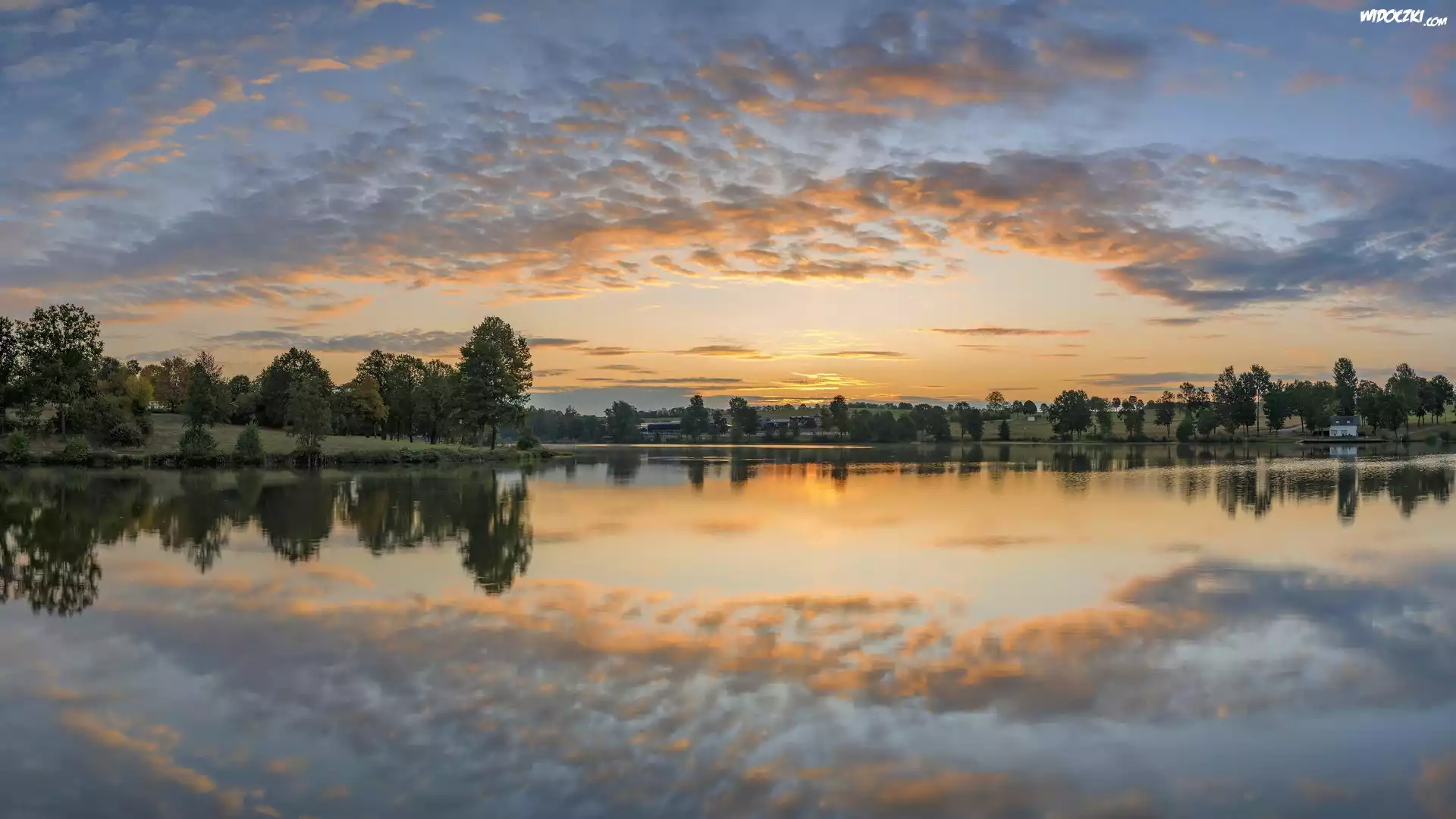 Park, Przyrody, Saar Hunsruck, Jezioro, Zbiornik, Kell, Drzewa, Wschód słońca, Chmury, Kell am See, Niemcy |