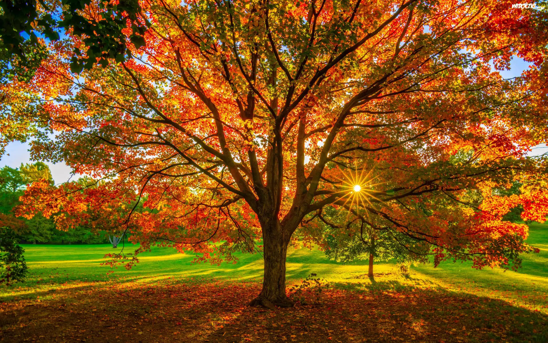 Jesień, Liście, Drzewo, Park, Promienie słońca