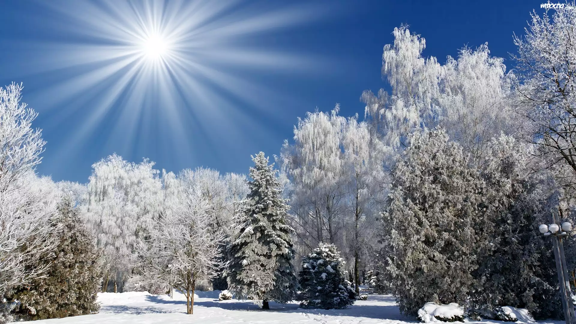 Zdjęcia, Park, Drzewa, Promienie, Słońca, Zima