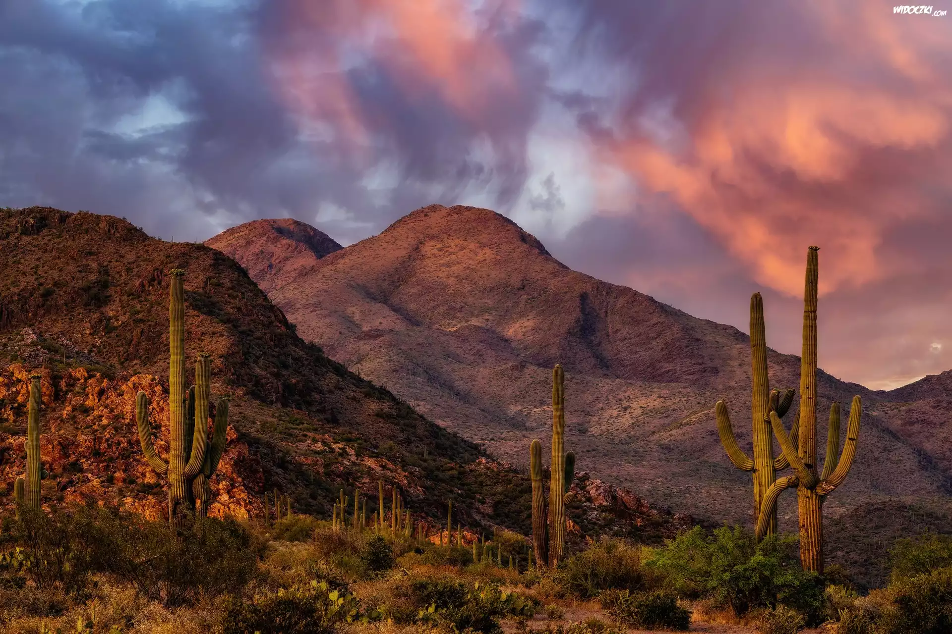 Zachód słońca, Góry, Pustynia, Sonora, Kaktusy, Saguaro, Chmury, Park Narodowy Saguaro, Arizona, Stany Zjednoczone |