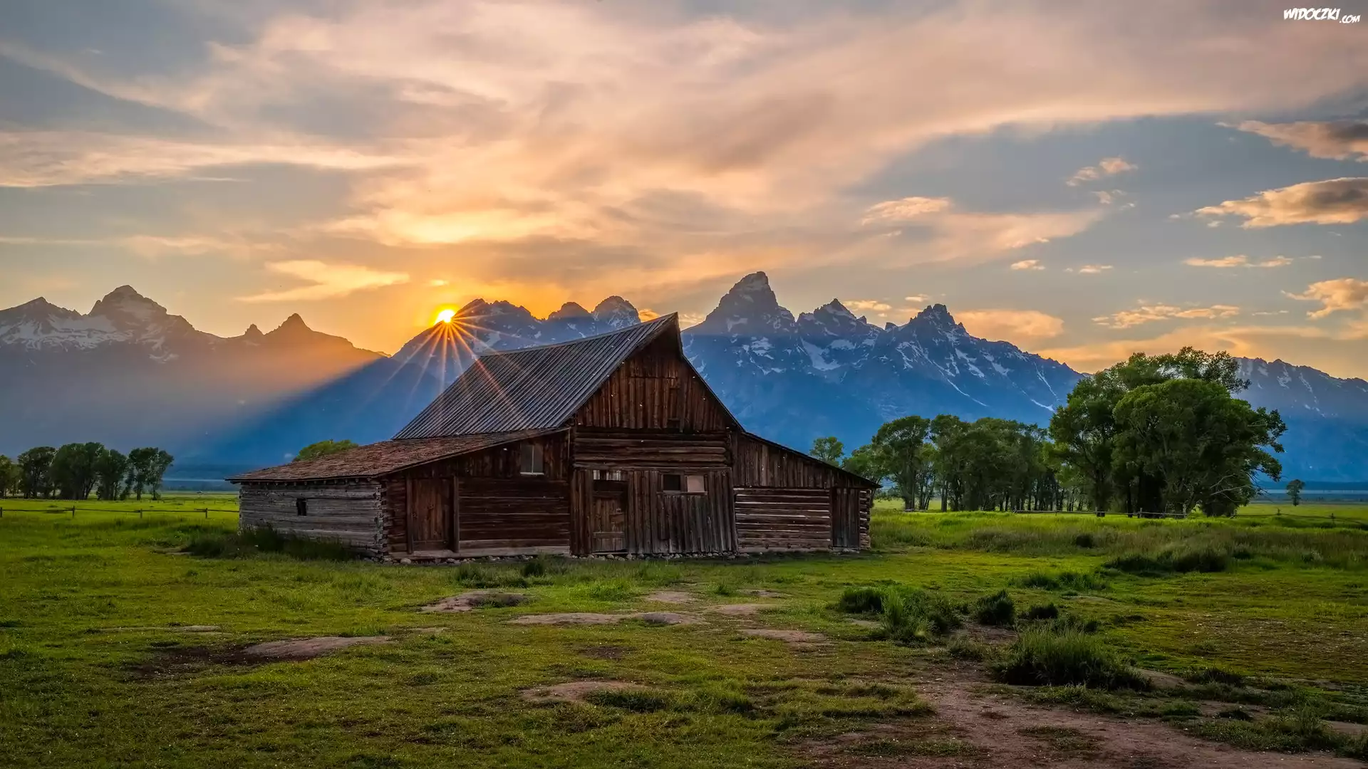 Chata, Góry, Zachód słońca, Promienie słońca, Drzewa, Park Narodowy Grand Teton, Stan Wyoming, Stany Zjednoczone |
