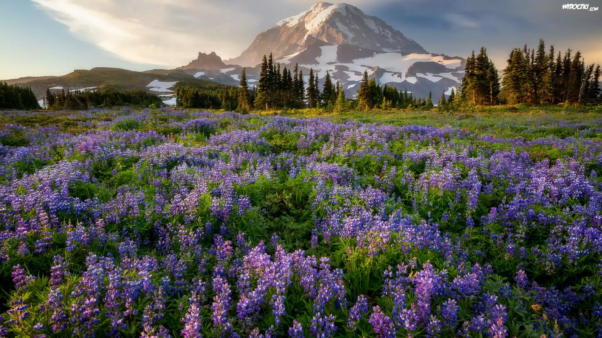 Góry, Łąka, Łubiny, Drzewa, Stratowulkan, Mount Rainier, Park Narodowy Mount Rainier, Stan Waszyngton, Stany Zjednoczone |