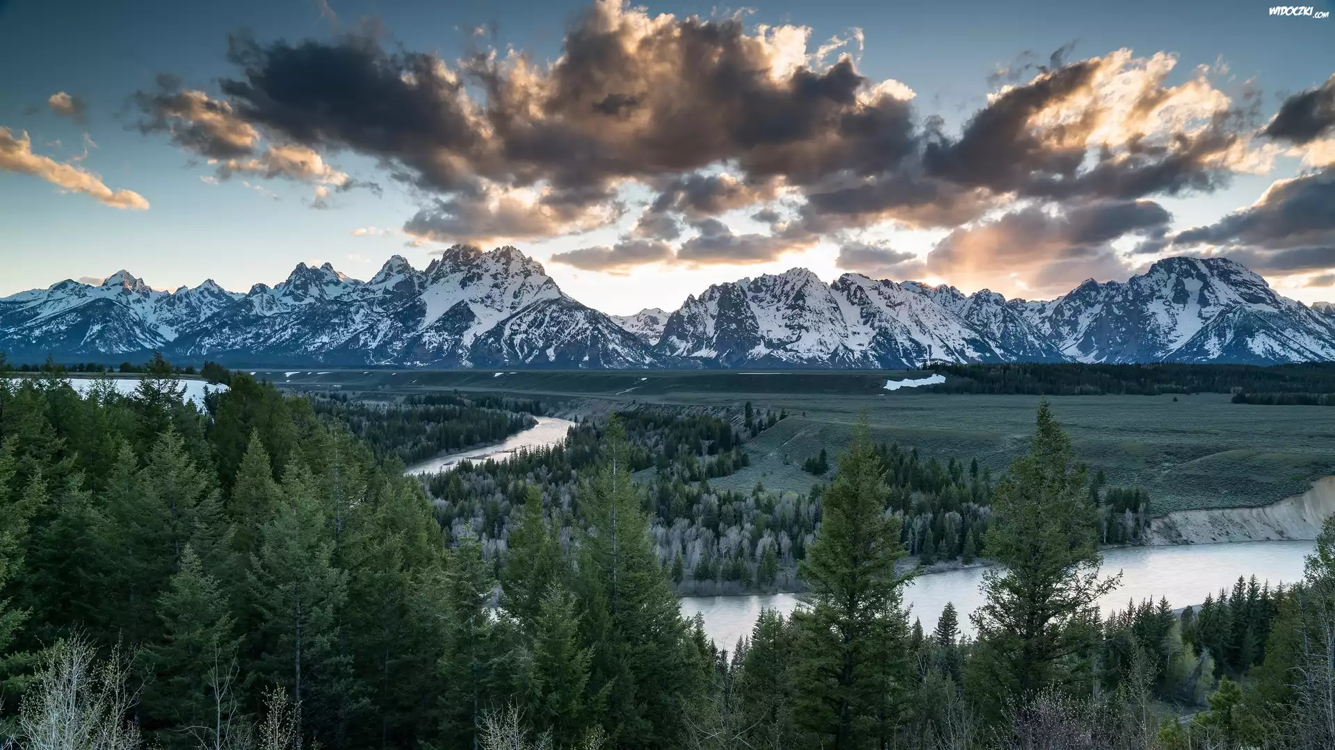 Park Narodowy Grand Teton, Chmury, Rzeka Snake River, Góry Skaliste, Las, Drzewa, Stan Wyoming, Stany Zjednoczone |