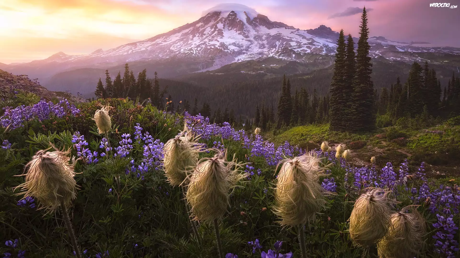 Park Narodowy Mount Rainier, Góry, Stratowulkan Mount Rainier, Drzewa, Łubin, Miądrzyga, Łąka, Stan Waszyngton, Stany Zjednoczone |