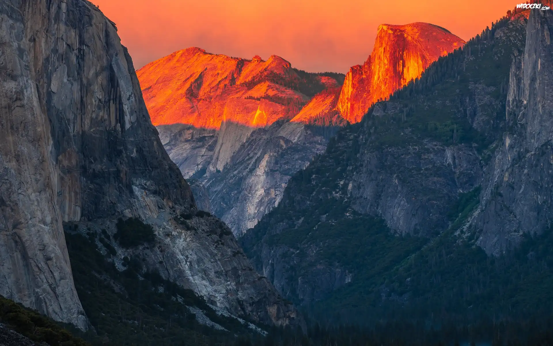 Park Narodowy Yosemite, Góry, Rozświetlone, Szczyty, Góra, Half Dome, Skały, Zachód słońca, Kalifornia, Stany Zjednoczone |