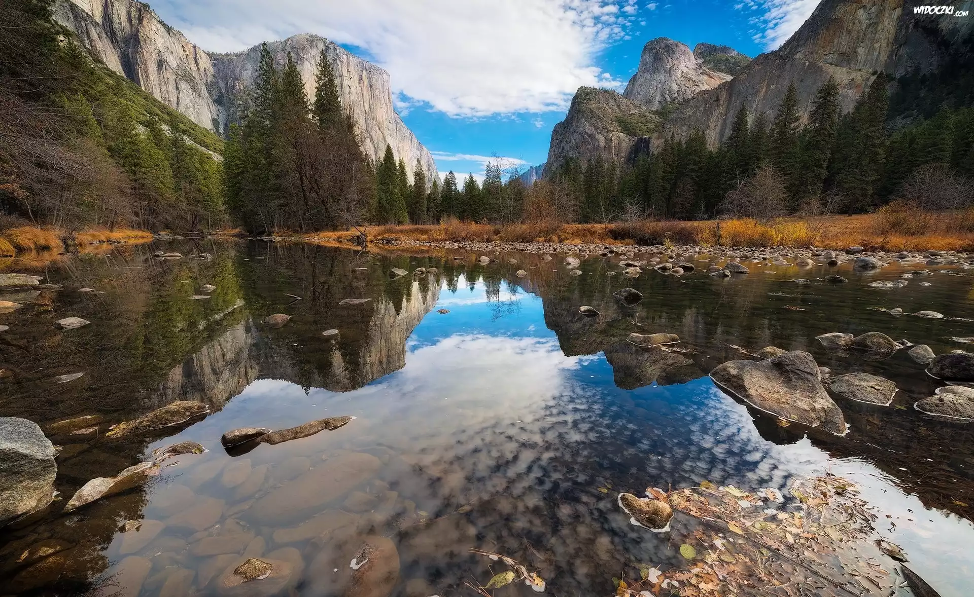 Stany Zjednoczone, Stan Kalifornia, Park Narodowy Yosemite, Dolina Valley, Drzewa, Góry, Kamienie, Odbicie, Chmury |