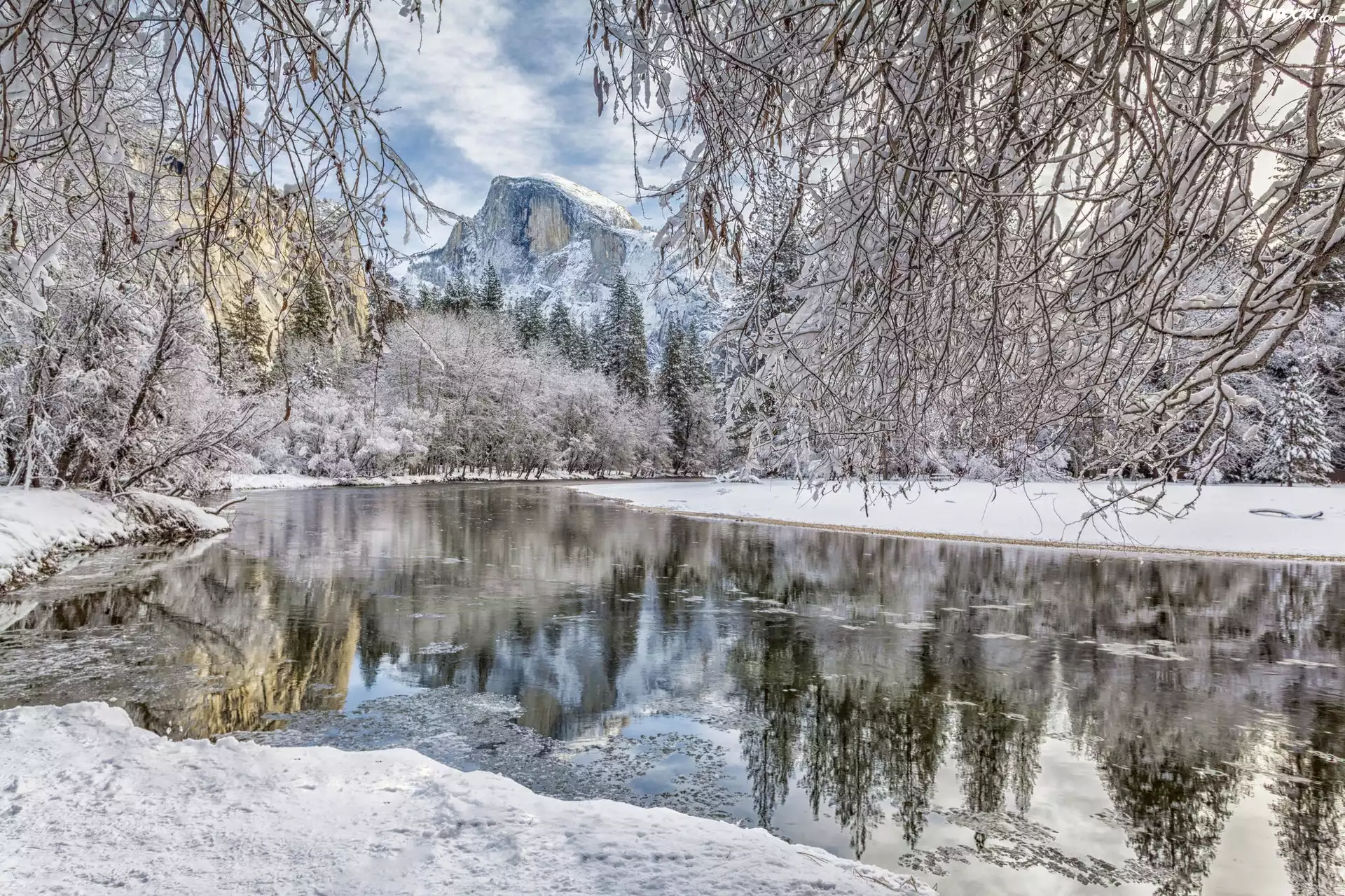 Stany Zjednoczone, Stan Kalifornia, Park Narodowy Yosemite, Zima, Rzeka Merced River, Góry, Las, Drzewa |