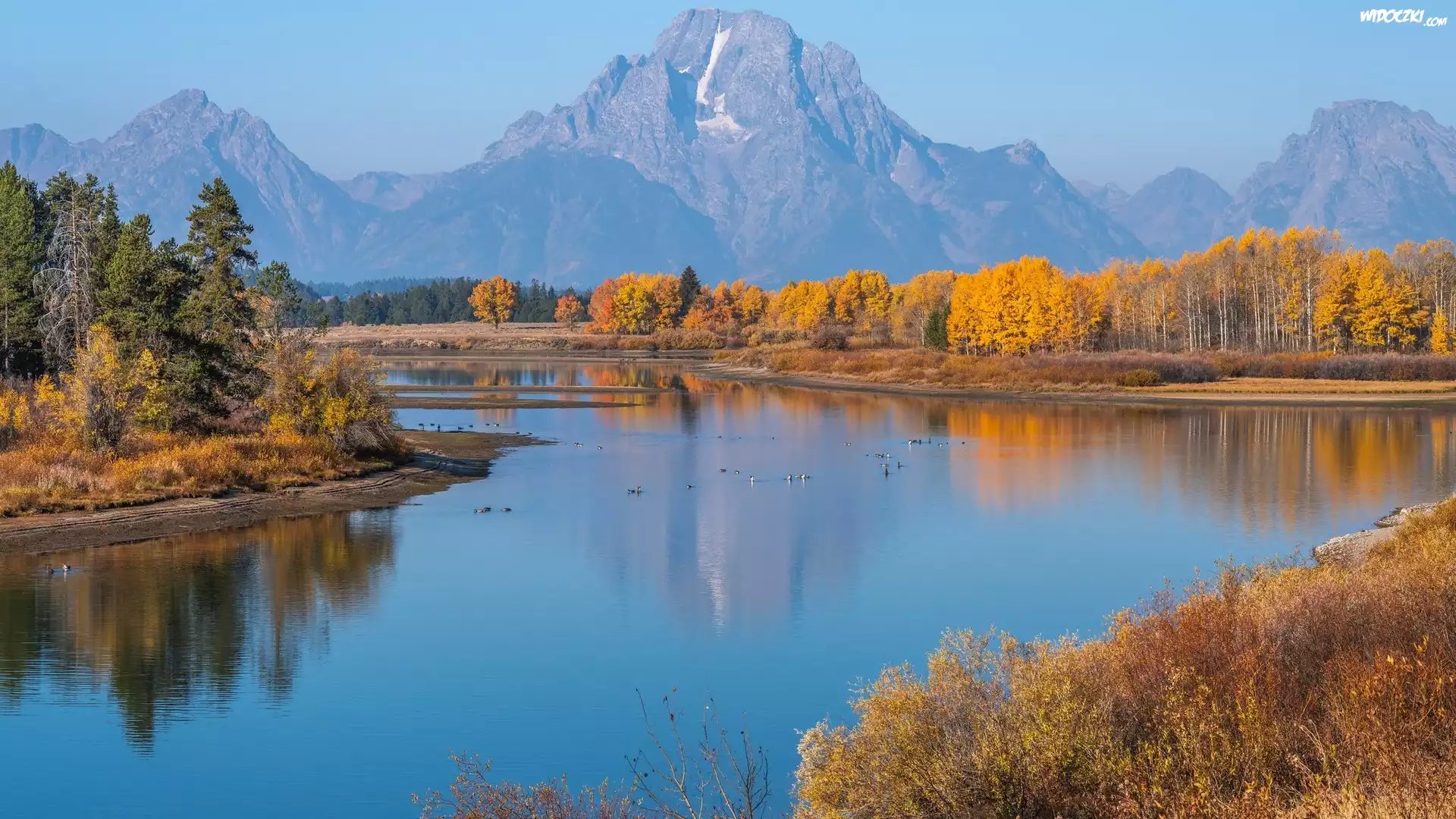 Park Narodowy Grand Teton, Rzeka, Snake River, Góry, Teton Range, Drzewa, Jesień, Stan Wyoming, Stany Zjednoczone |