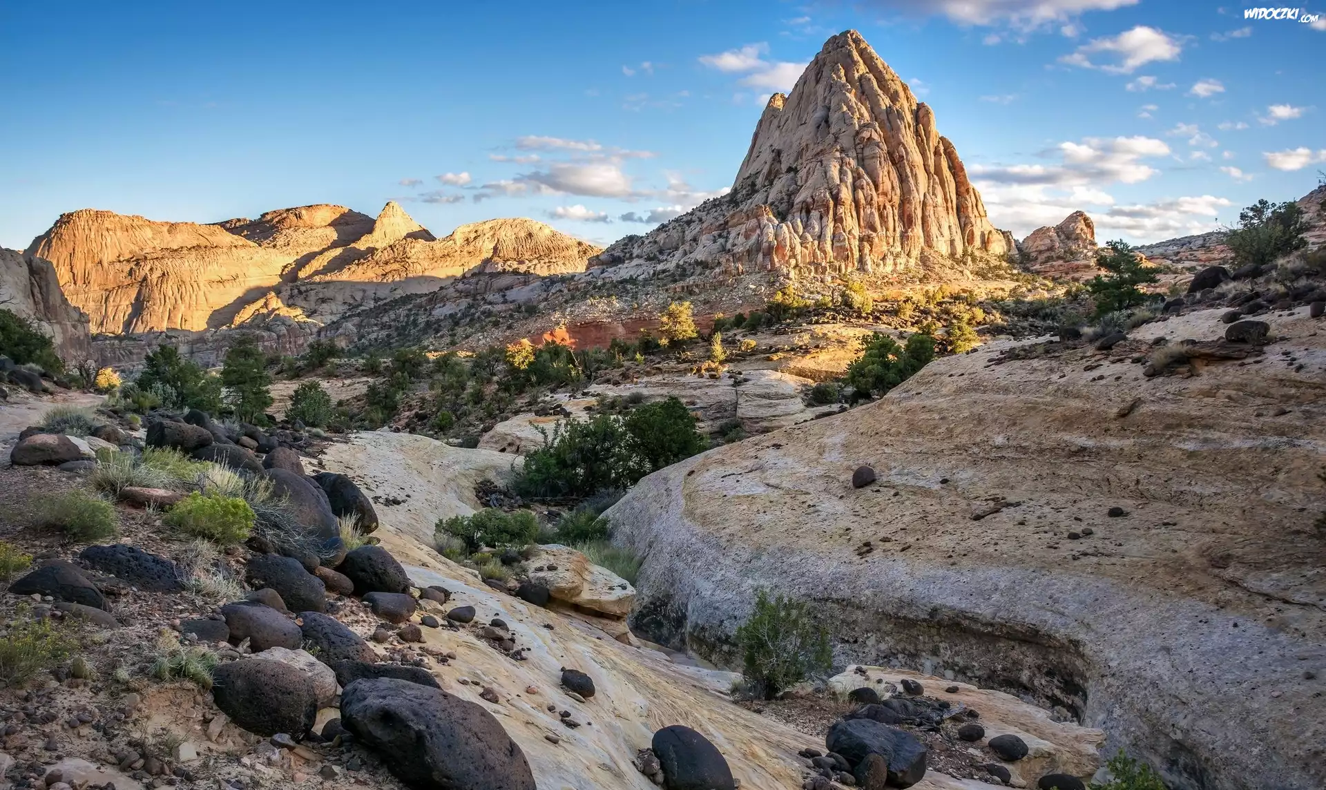 Stany Zjednoczone, Stan Utah, Park Narodowy Capitol Reef, Góra Pectols Pyramid, Góry, Rośliny, Kamienie |