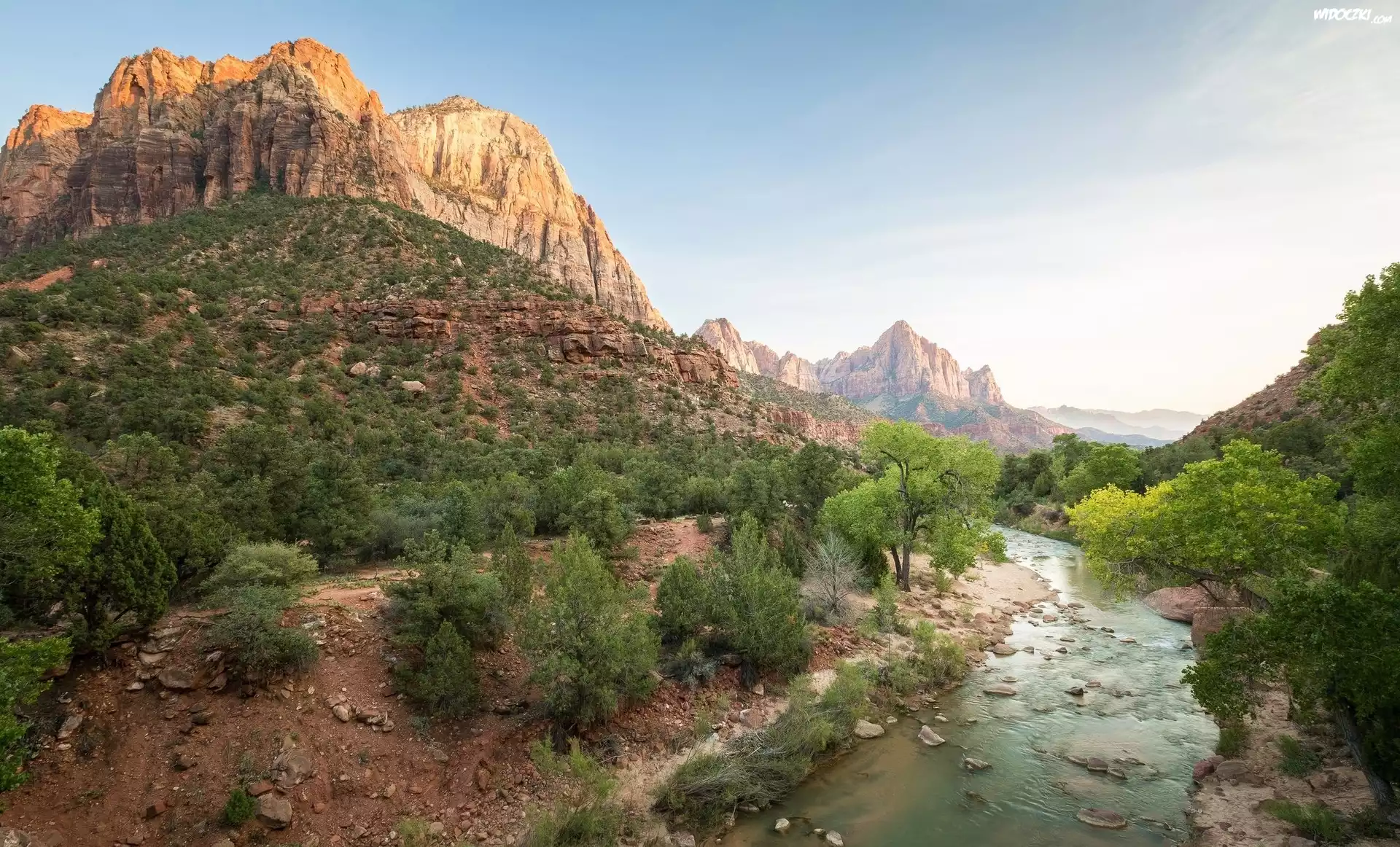 Stany Zjednoczone, Stan Utah, Park Narodowy Zion, Góra Watchman, Góry, Rzeka Virgin River, Drzewa