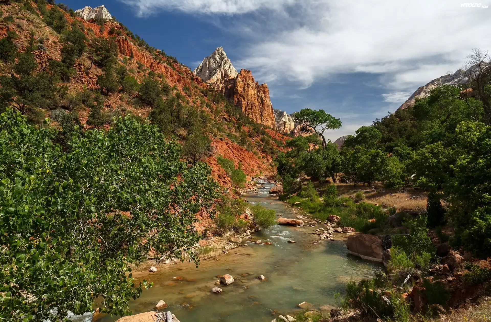 Zdjęcia, Stany Zjednoczone, Stan Utah, Park Narodowy Zion, Góra Watchman, Rzeka Virgin River, Drzewa, Góry