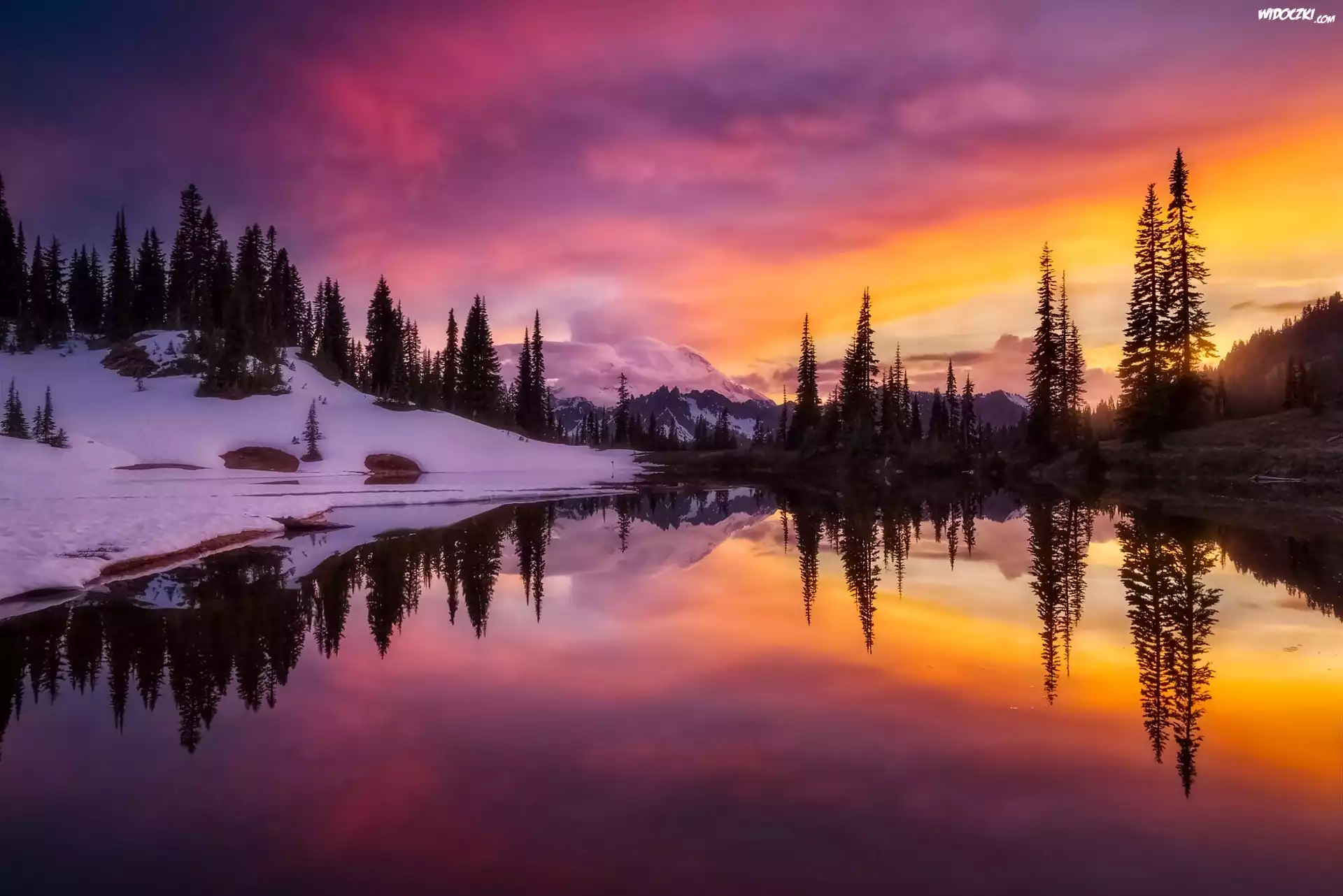 Stany Zjednoczone, Stan Waszyngton, Park Narodowy Mount Rainier, Jezioro, Zachód Słońca, Góry, Zima, Drzewa |