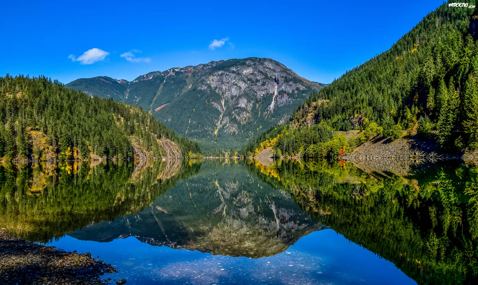 Stany Zjednoczone, Stan Waszyngton, Park Narodowy Północnych Gór Kaskadowych, Góry, Jezioro Diablo, Drzewa, Odbicie |