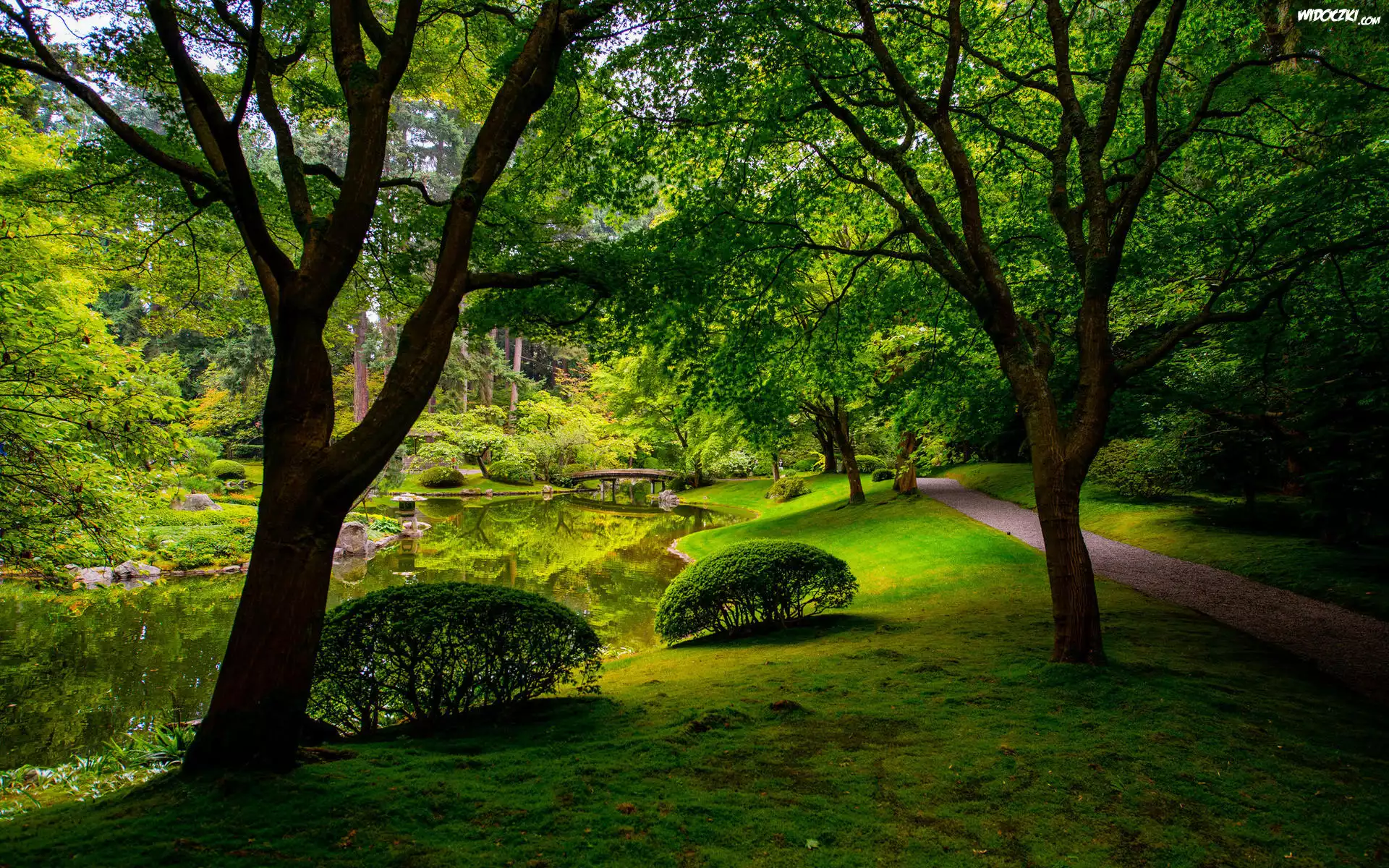 Park, Ogród, Nitobe Memorial Garden, Drzewa, Krzewy, Trawa, Ścieżka, Staw, Kamienie, Mostek, West Point Grey, Vancouver, Kanada |