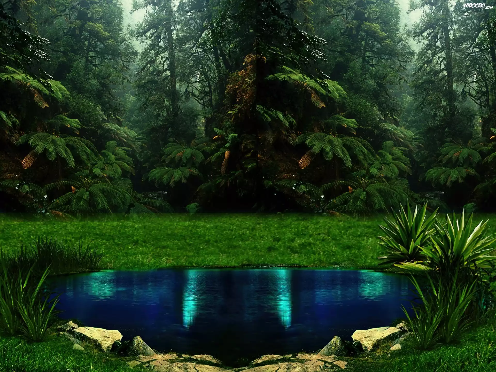 Zdj臋cia, Park, Drzewa, Staw, Kamienie