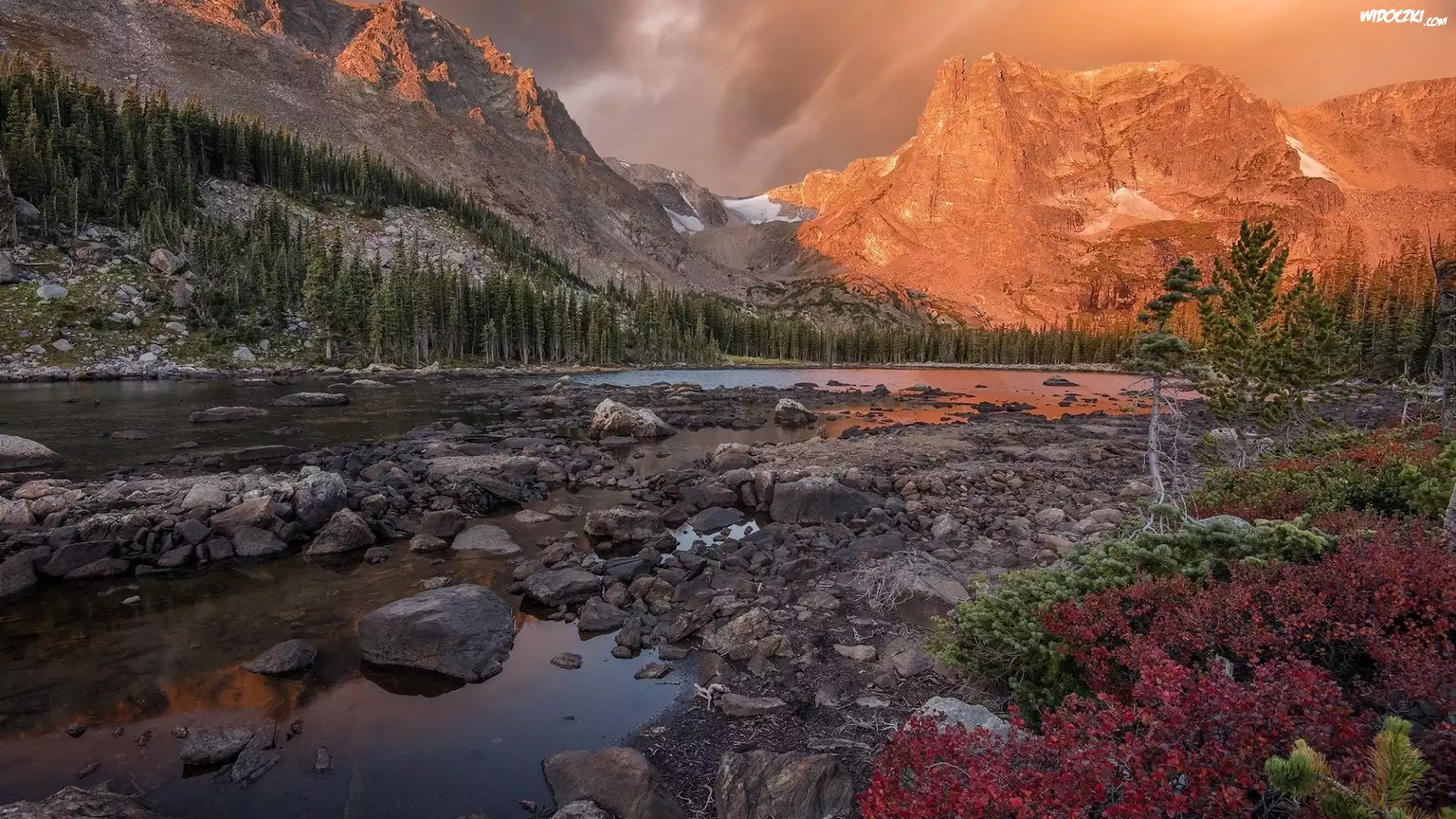 Park Narodowy Gór Skalistych, Stan Kolorado, Stany Zjednoczone, Góry, Szczyt Notchtop, Drzewa, Jezioro Helene Lake, Kamienie, Rośliny |
