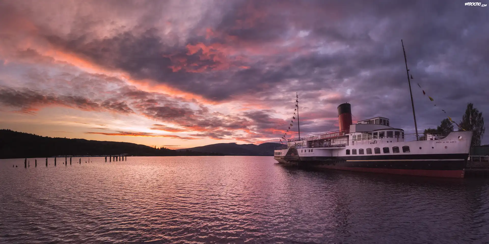 Szkocja, Park Narodowy Loch Lomond and the Trossachs, Jezioro Loch Lomond, Zachód słońca, Statek, Parowiec PS Maid of the Loch |