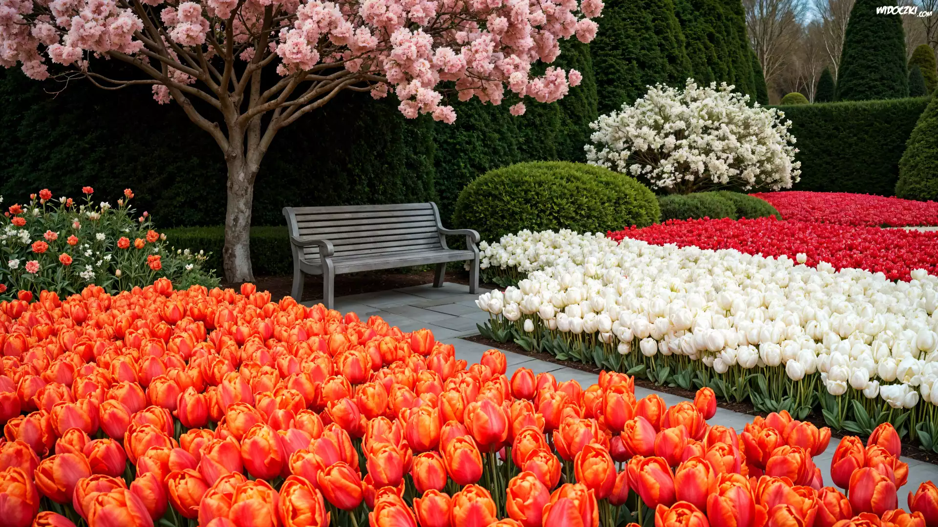 Wiosna, Park, Tulipany, Drzewa, Ławka