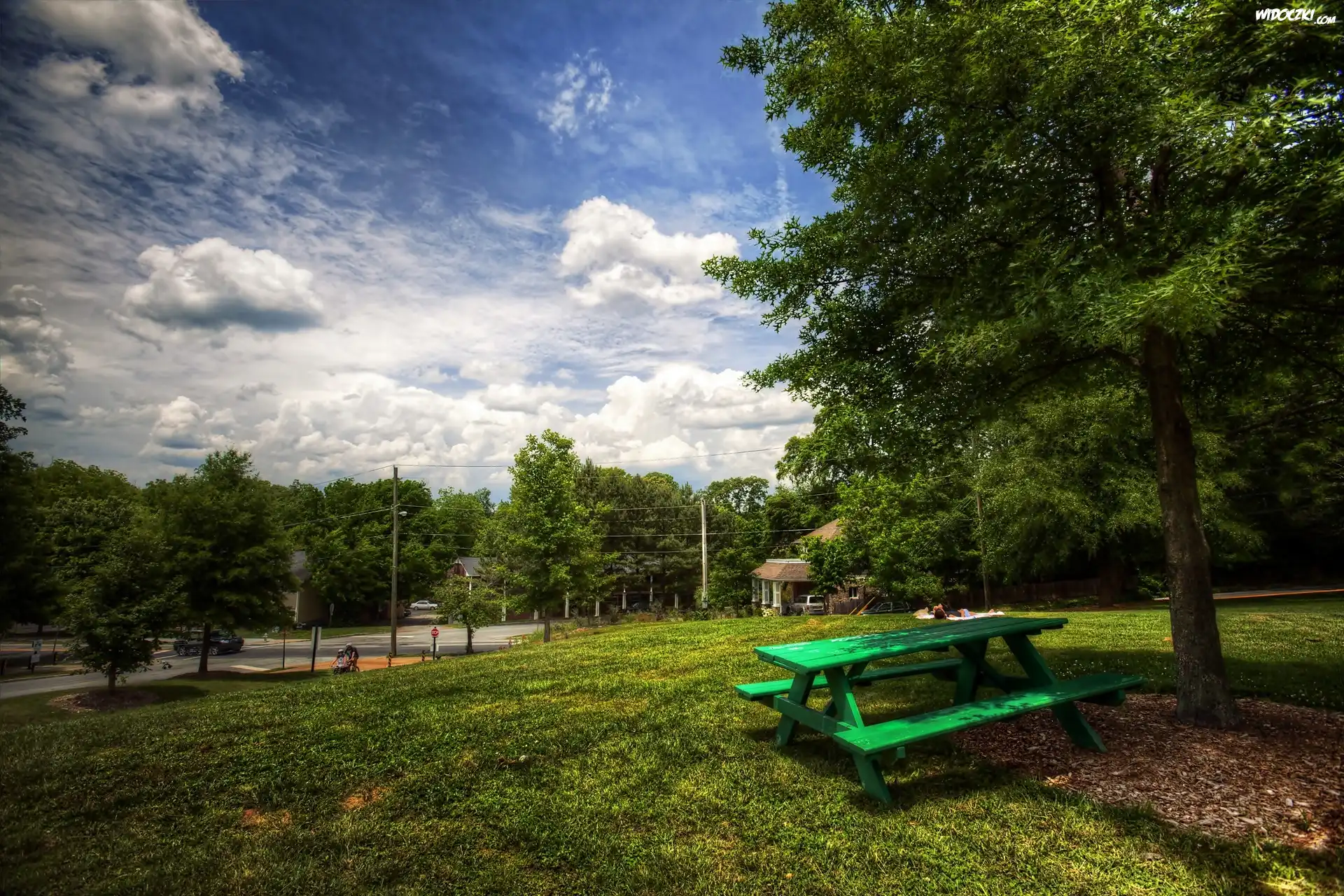 Zdjęcia, Park, Ławeczka, Domy, Ulica, Chmury