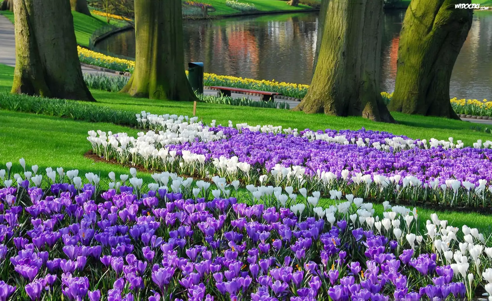 Zdjęcia, Park, Ławeczka, Jeziorko, Krokusy