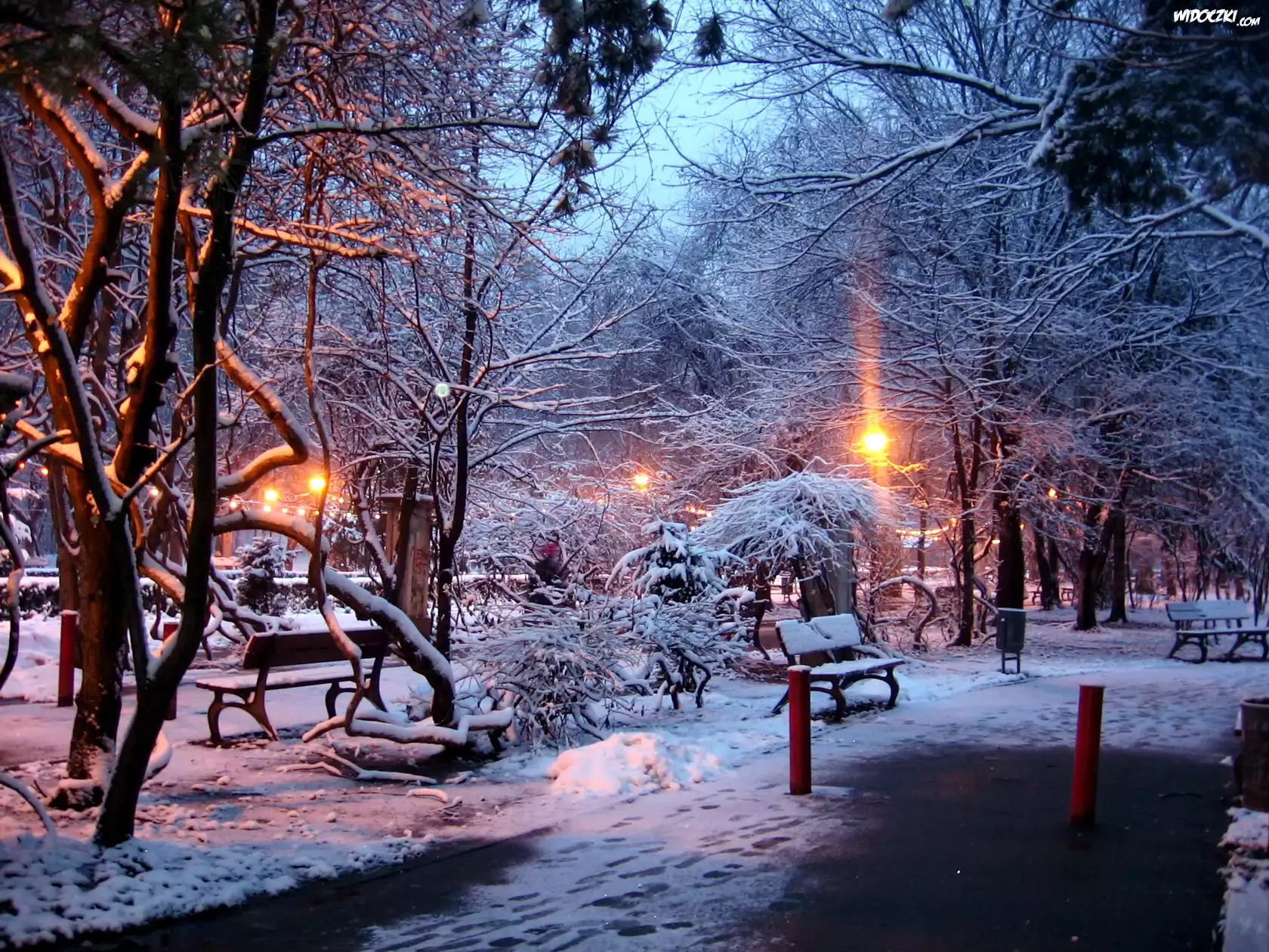 Zdjęcia, Park, Drzewa, Ławki, Przebijające, Światło, Zima