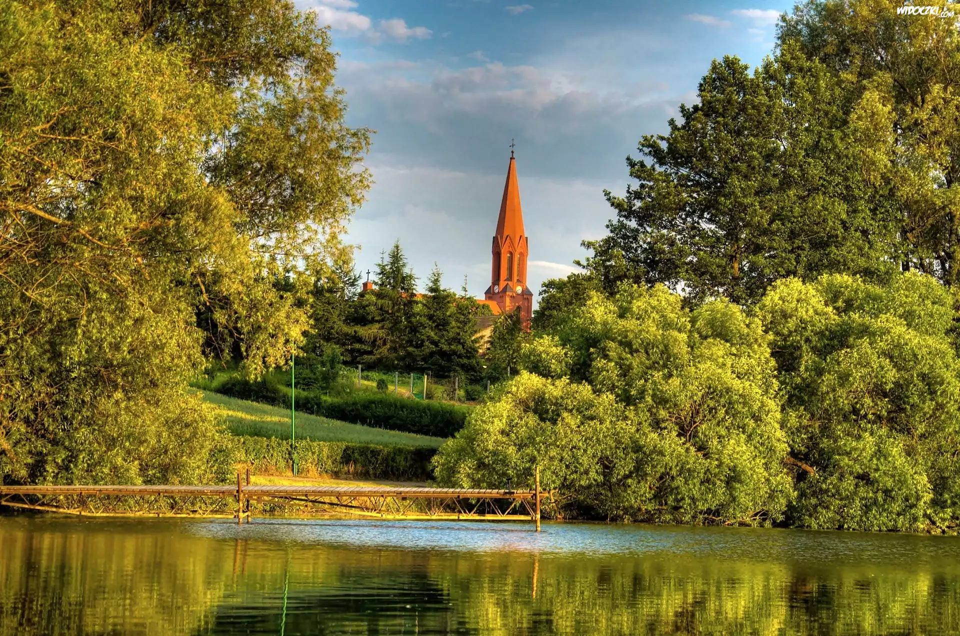 Zdjęcia, Park, Jezioro, Pomost, Wieża, Kościoła