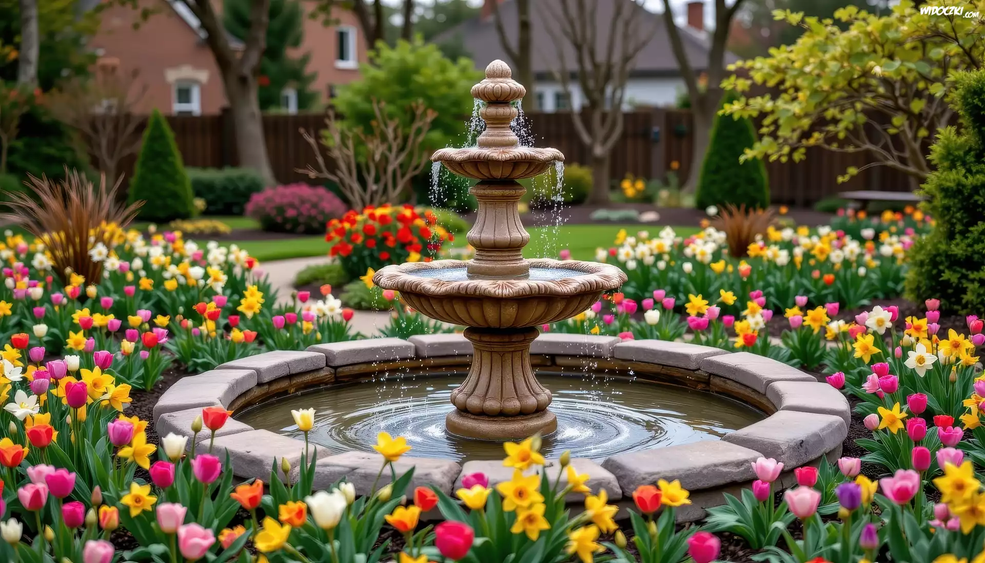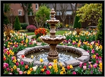 Zdjęcia, Park, Kamienna, Fontanna, Kolorowe, Kwiaty, Tulipany, Żonkile, Drzewa, Wiosna, AI