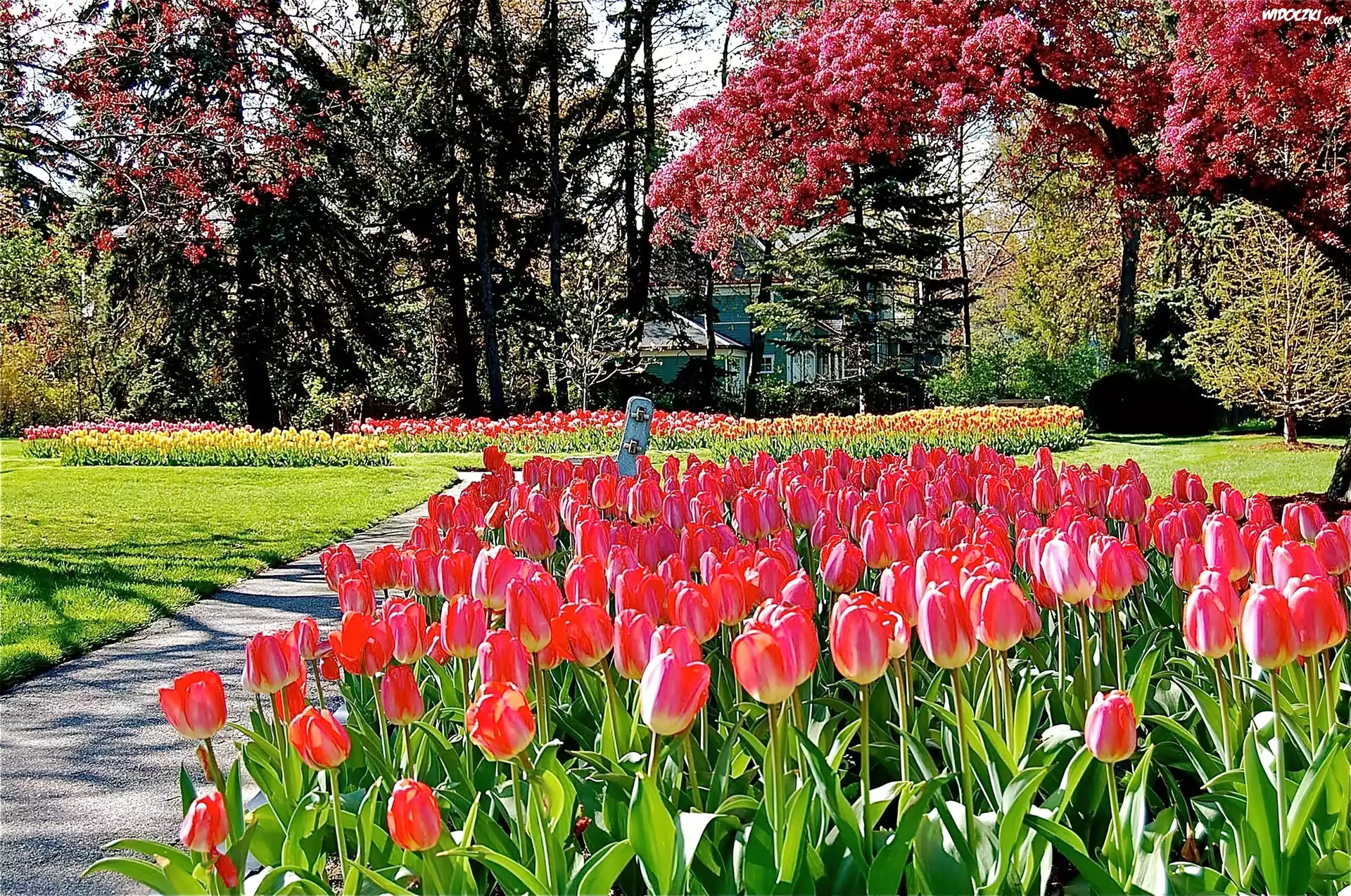 Wiosna, Park, Kwitnące, Drzewa, Tulipany, Przebijające, Światło
