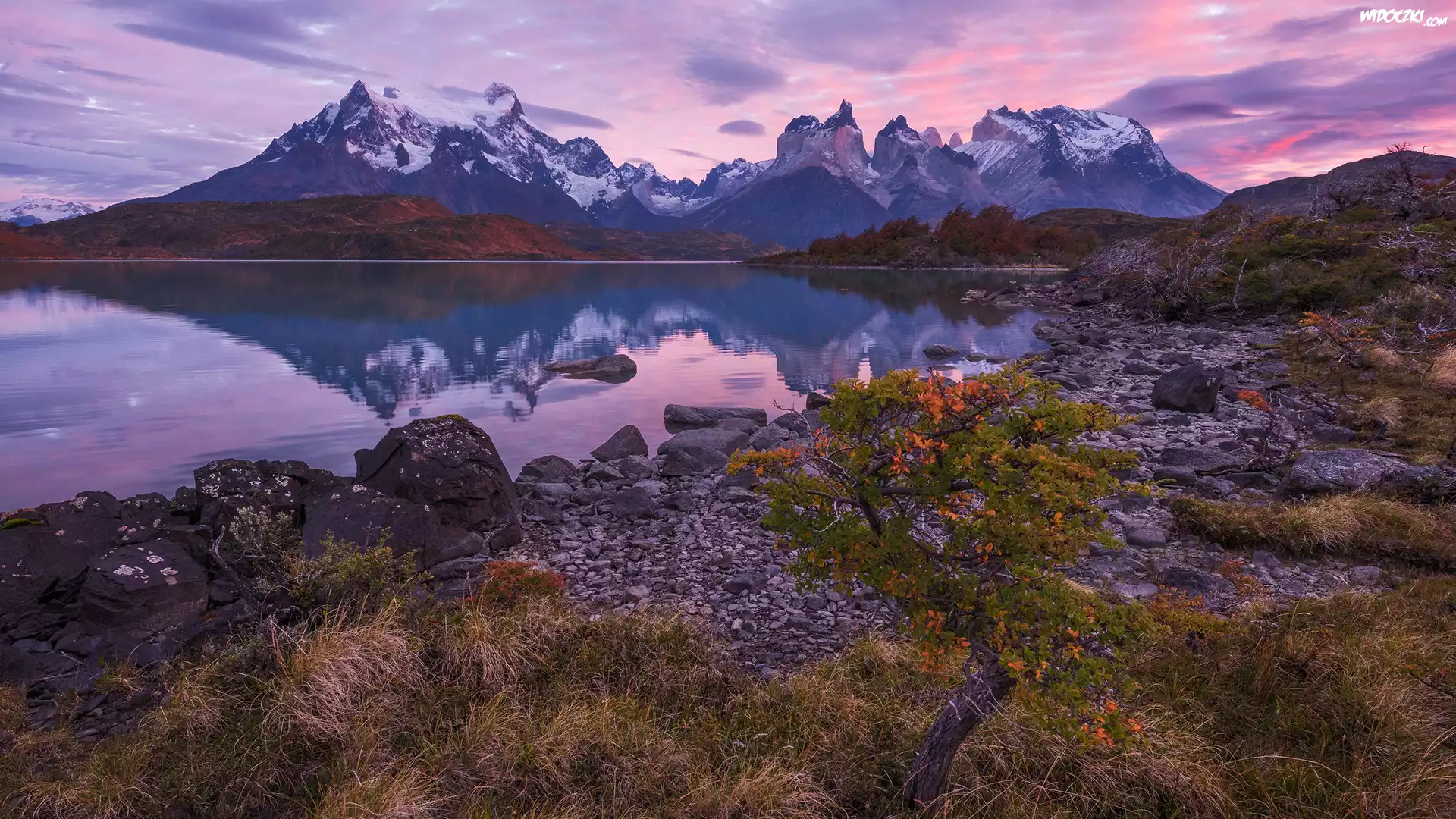 Chile, Patagonia, Park Narodowy Torres del Paine, Jezioro Pehoé, Góry Cordillera del Paine, Masyw Torres del Paine, Kamienie, Brzeg, Roślinność, Wschód słońca |