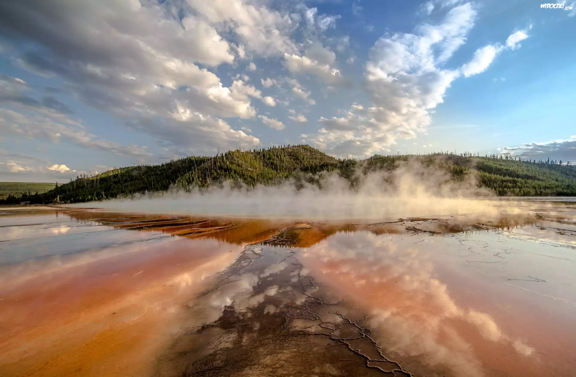 Stany Zjednoczone, Park Narodowy Yellowstone, Gorące, Źródło, Opary, Zalesione, Wzgórze, Chmury