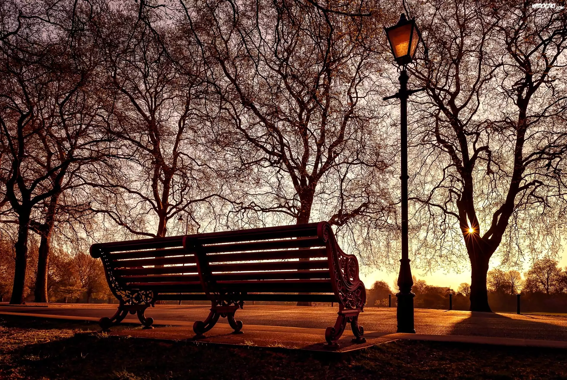 Zdjęcia, Park, Ławka, Latarnia, Drzewa, Zachód Słońca