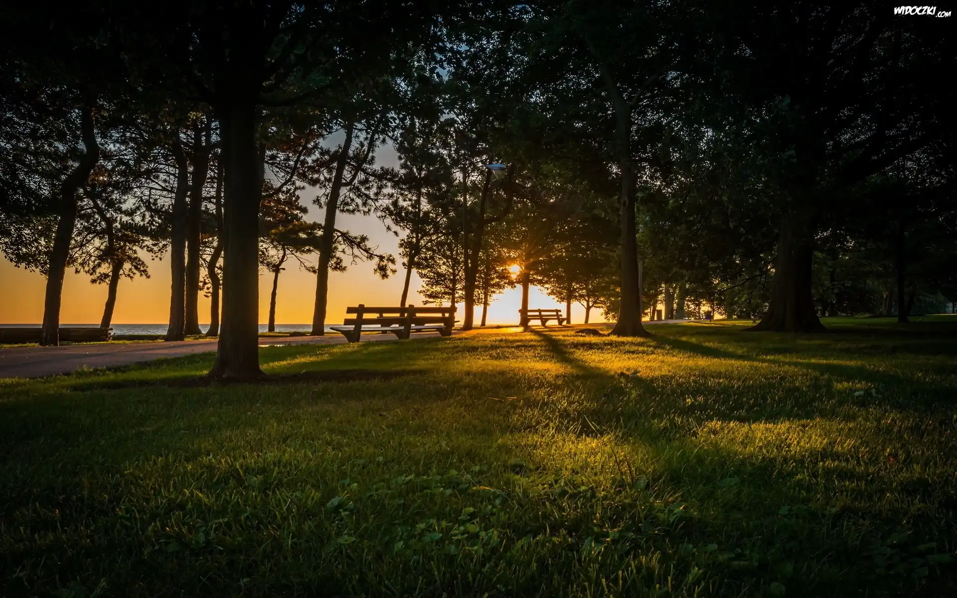 Zdjęcia, Park, Ławki, Trawnik, Zachód Słońca