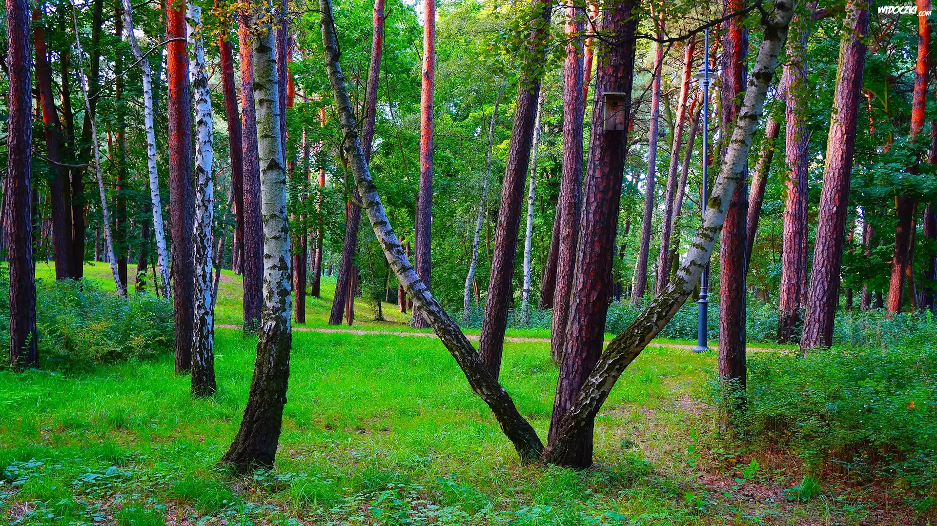 Zdjęcia, Park, Drzewa, Brzozy, Zieleń, Rośliny