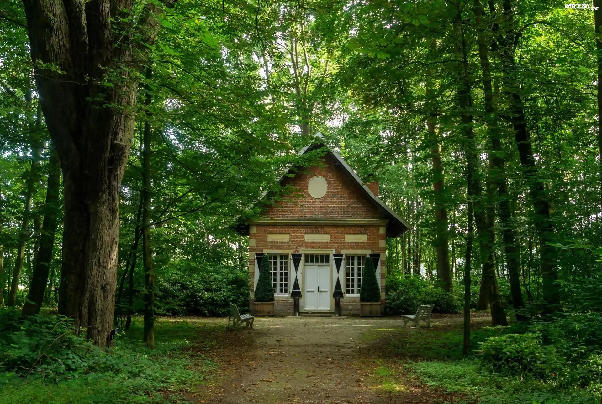 Zdjęcia, Park, Domek, Alejki, Ławki, Zielone, Drzewa