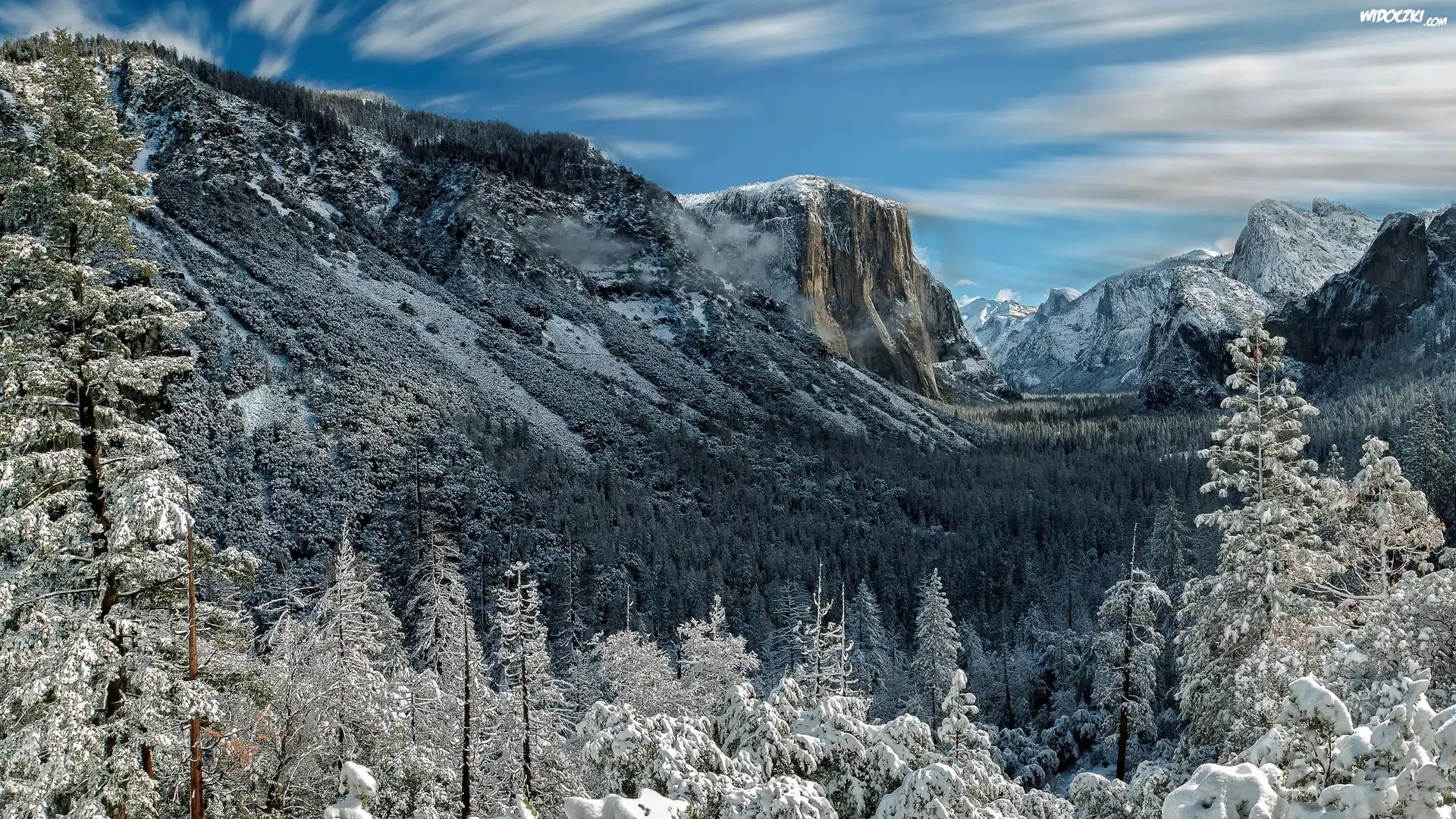 Park Narodowy Yosemite, Zima, Góry, Dolina Yosemite Valley, Drzewa, Stan Kalifornia, Stany Zjednoczone |