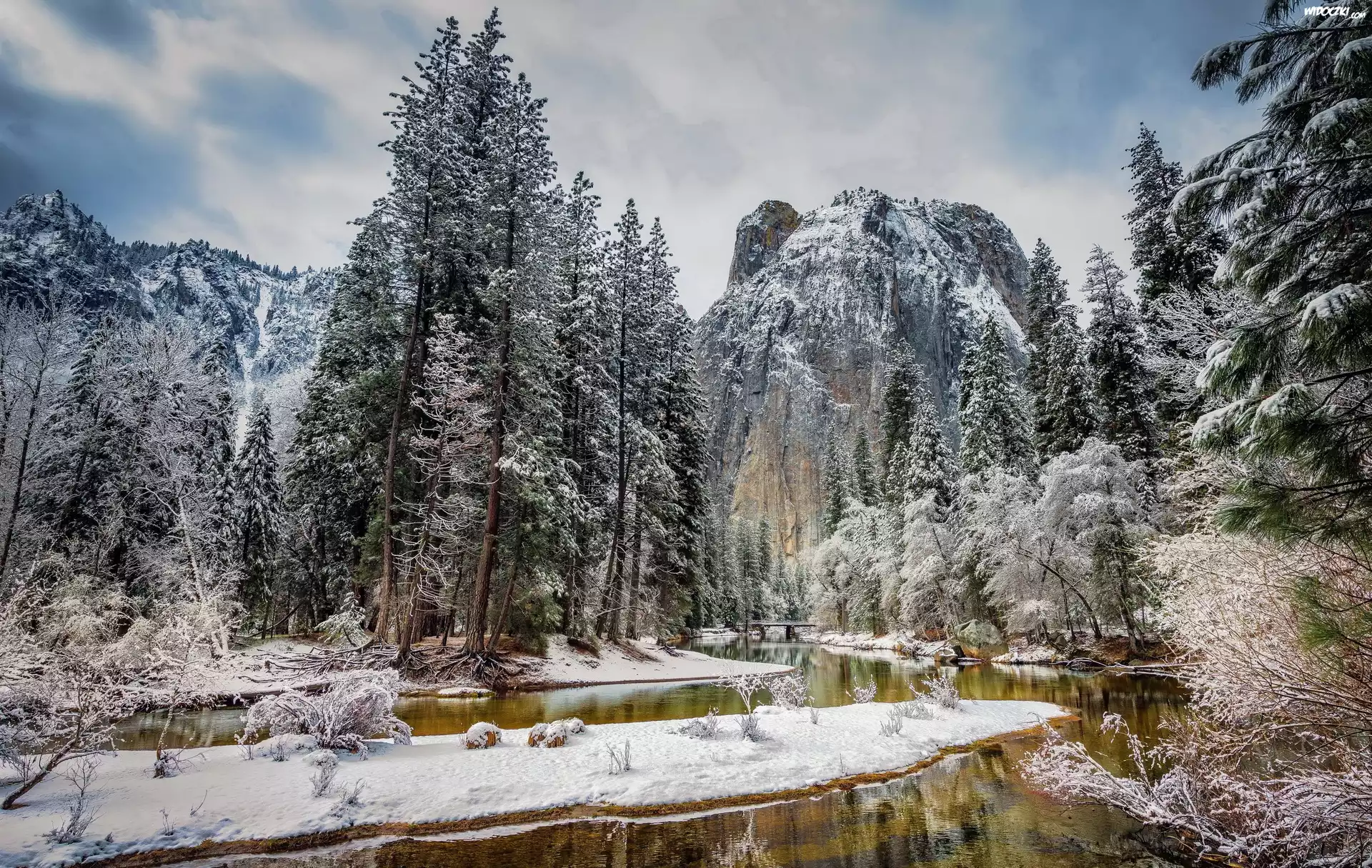Zdjęcia, Stany Zjednoczone, Stan Kalifornia, Park Narodowy Yosemite, Zima, Rzeka, Góry, Świerki
