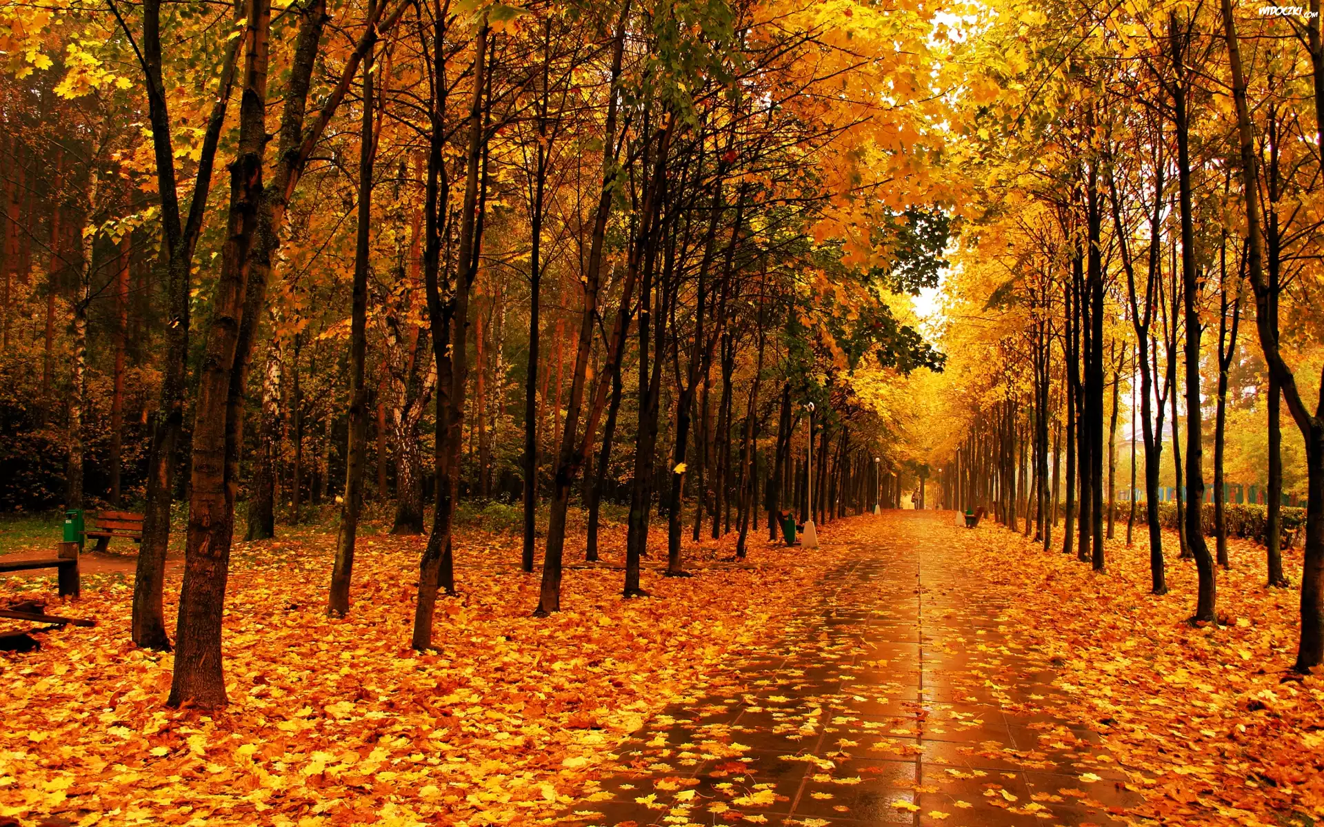 Zdjęcia, Park, Jesienią, Złote, Liście