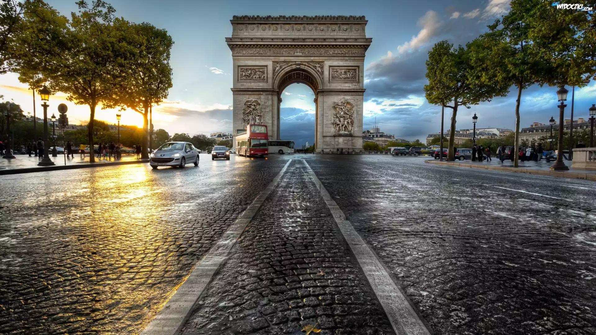 Zdjęcia, Francja, Paryż, Ulica, Łuk Triumfalny, Samochody, Autobusy, Drzewa