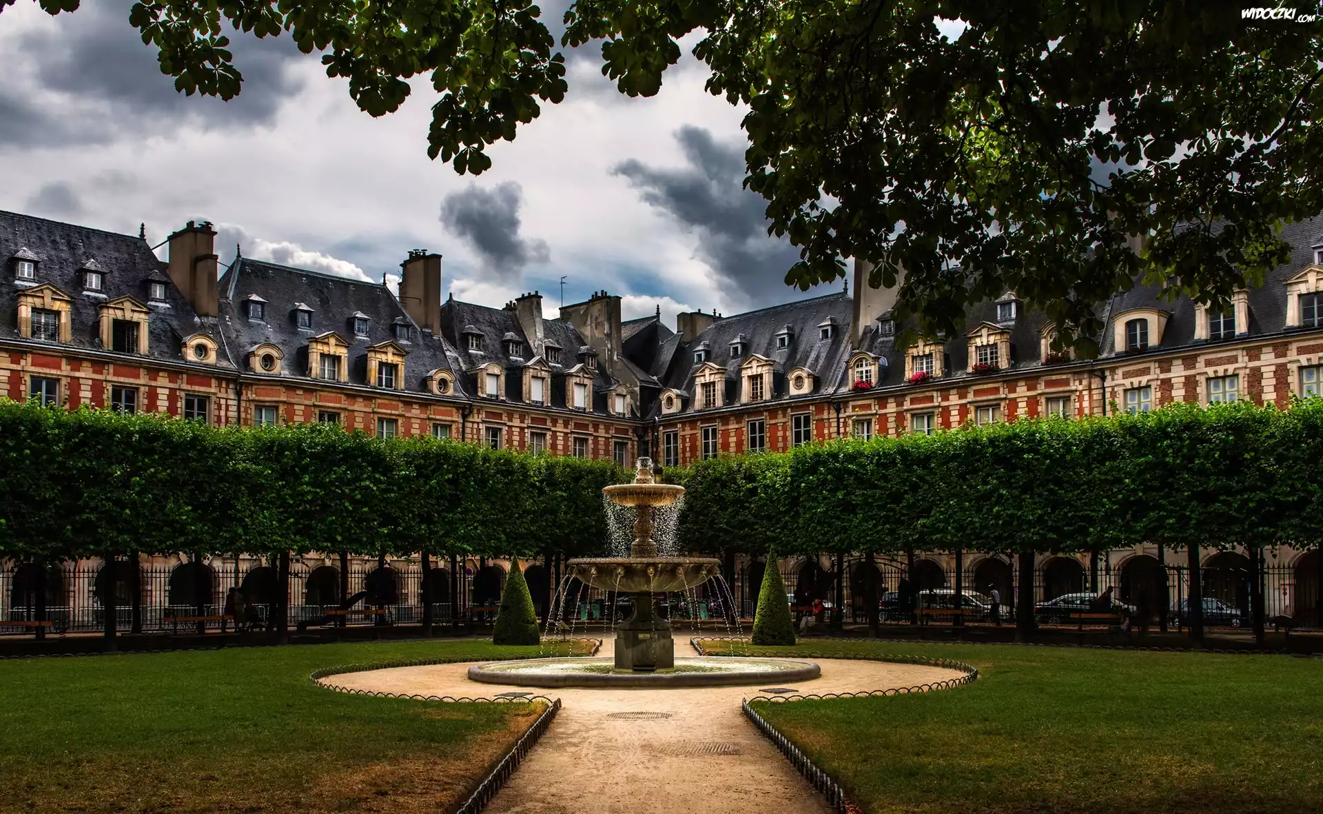 Zdjęcia, Francja, Paryż, Plac Wogezów, Park, Fontanna, Domy