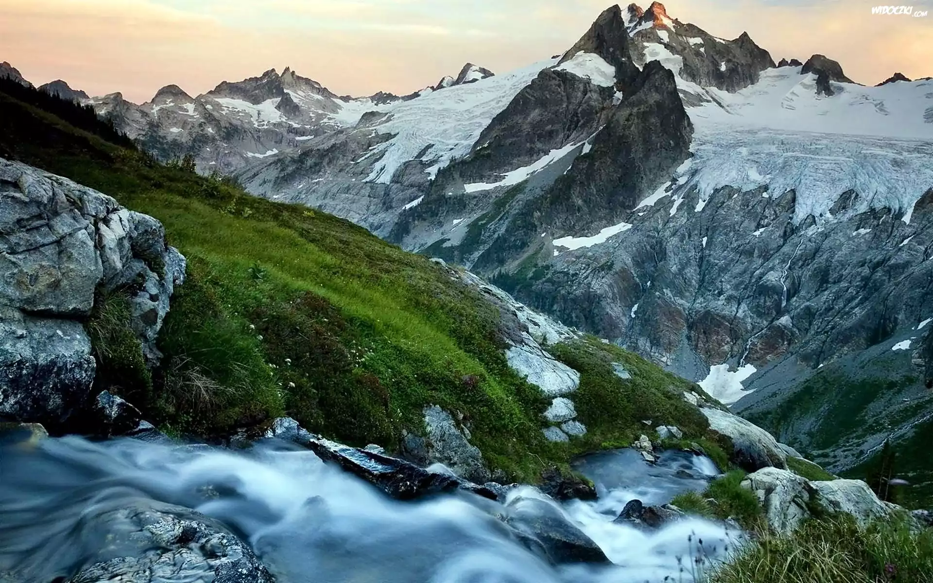 Patagonia, Góry, Lodowiec, Kanion, Łąka, Potok