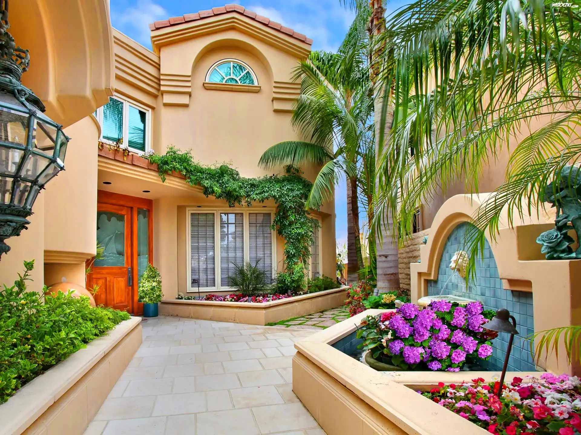 Patio, Dom, Kwiaty, Palmy