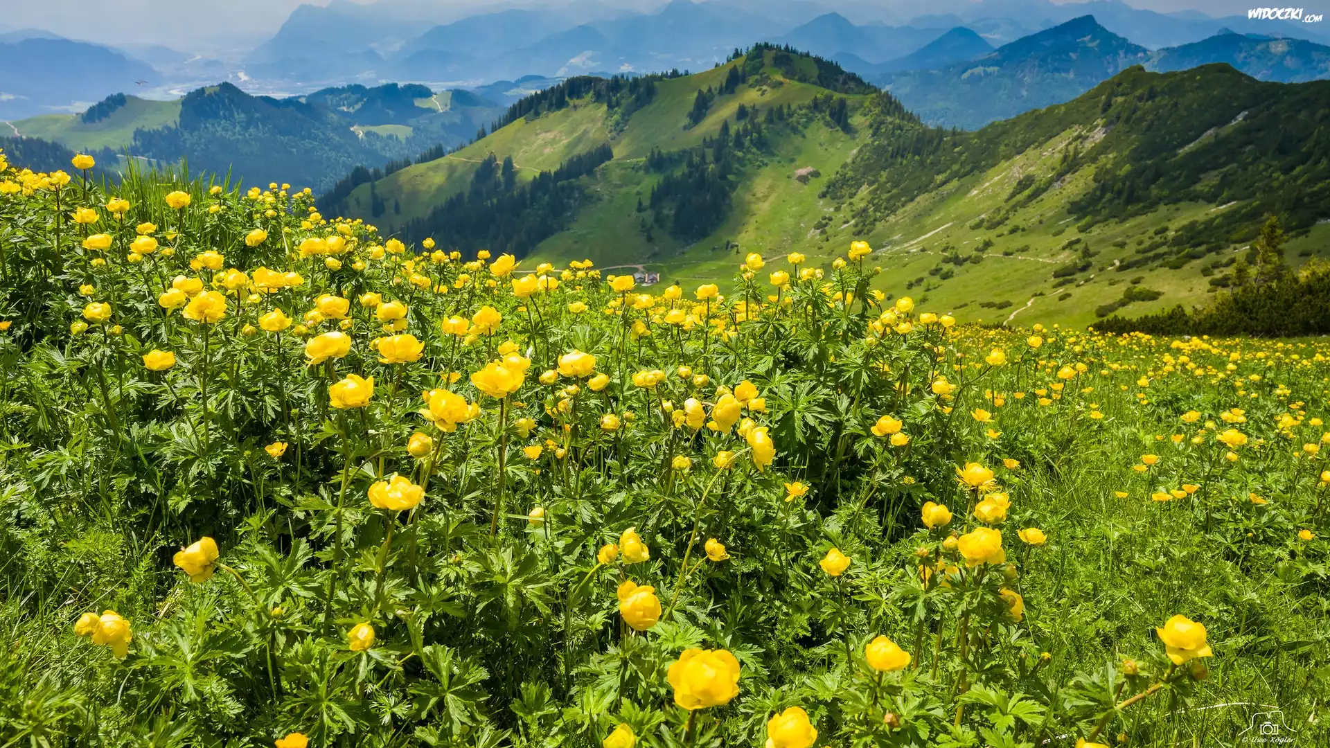 Zdjęcia, Niemcy, Bawaria, Góry, Alpy, Dolina, Kwiaty, Wiosna, Pełnik
