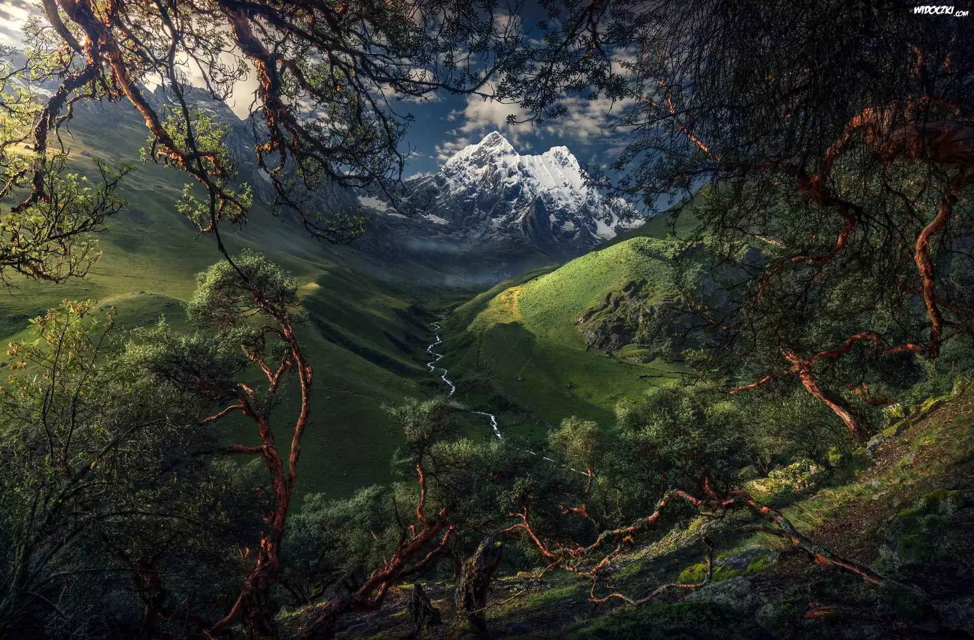 Zdjęcia, Drzewa, Góry, Kordyliera Biała, Rzeka, Dolina, Park Narodowy Huascaran, Peru