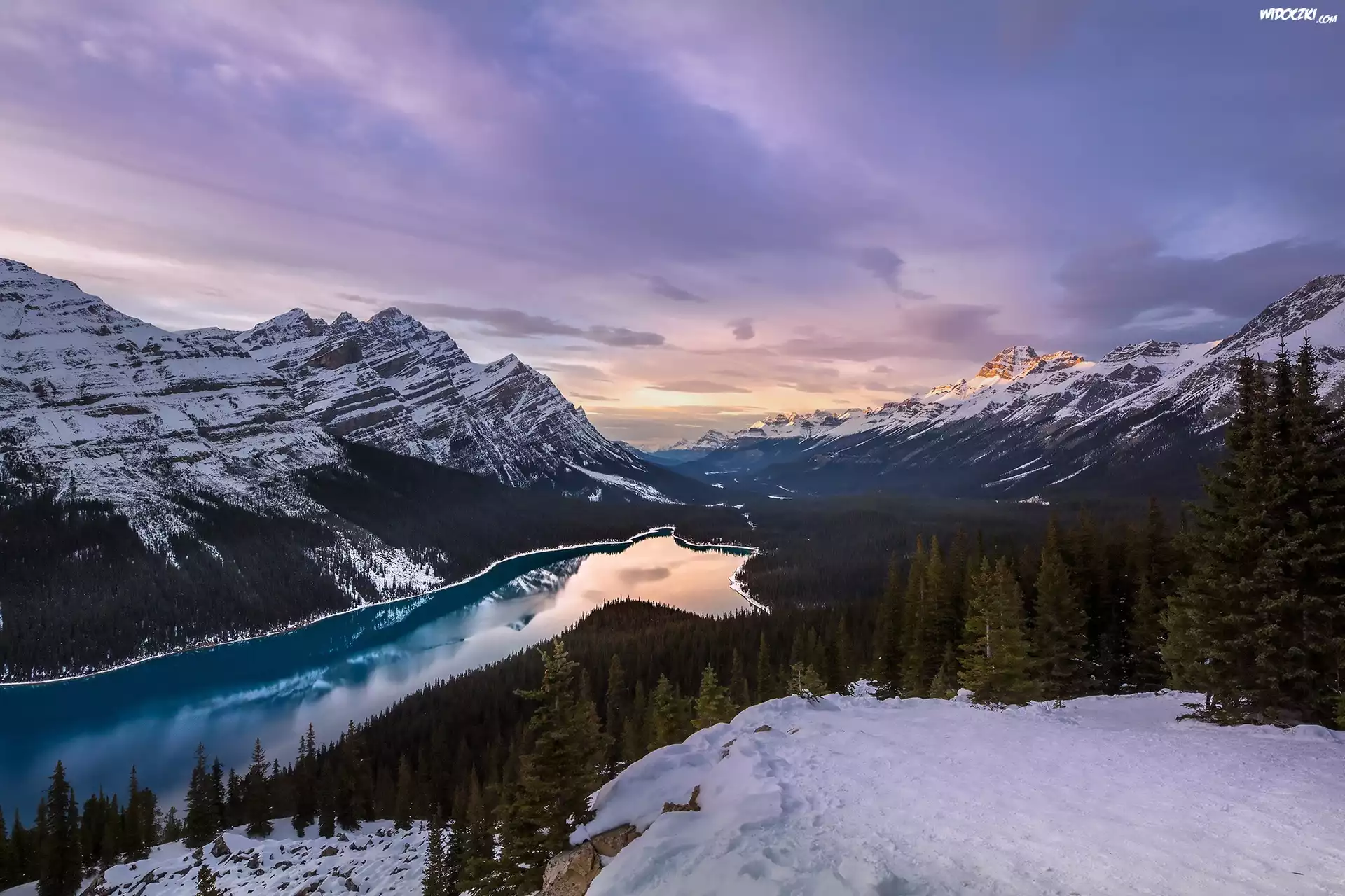 Zdjęcia, Kanada, Park Narodowy Banff, Jezioro Peyto Lake, Góry Canadian Rockies, Lasy, Zima