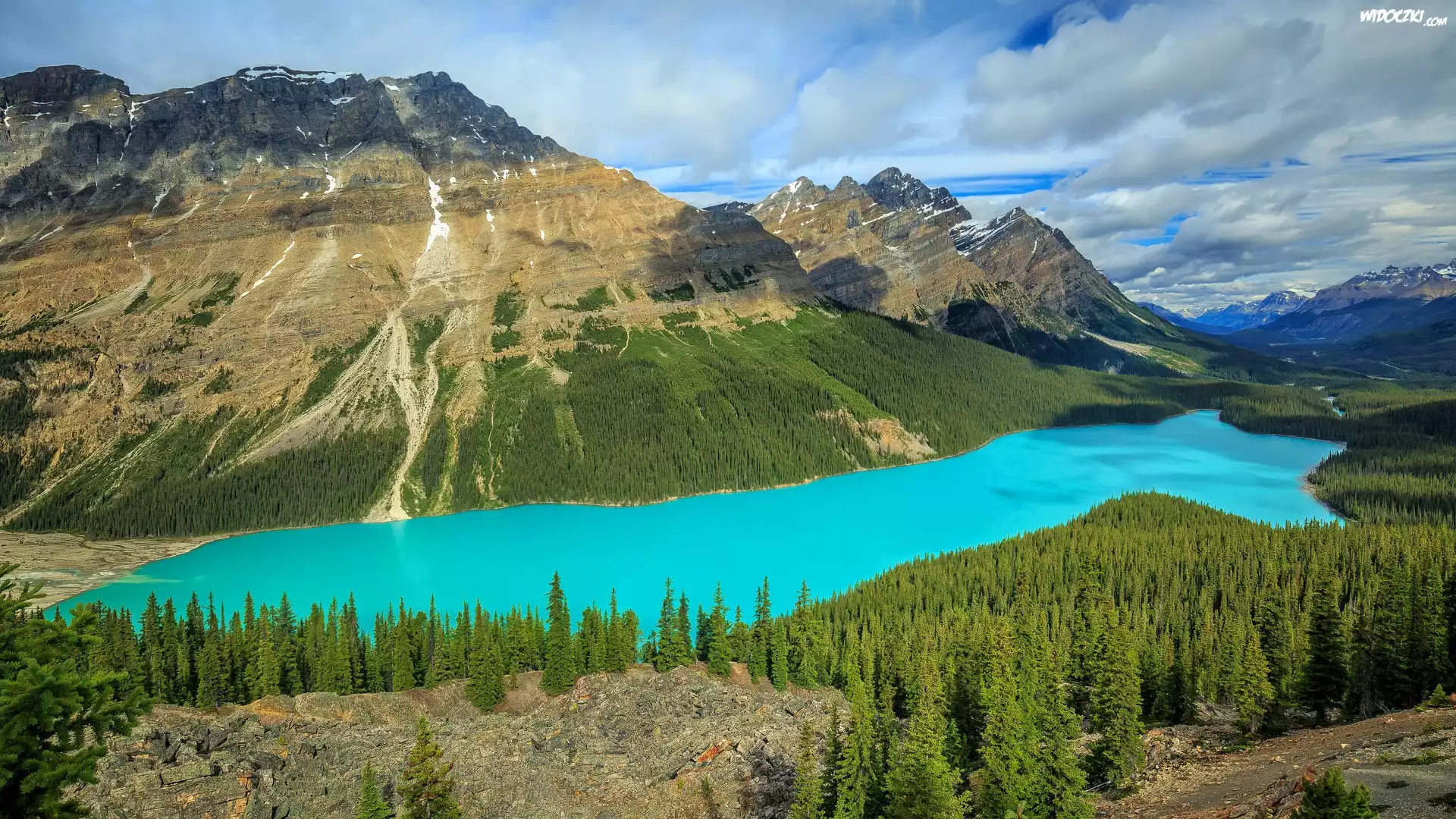Park Narodowy Banff, Jezioro, Peyto Lake, Skały, Góry, Las, Drzewa, Chmury, Prowincja Alberta, Kanada |