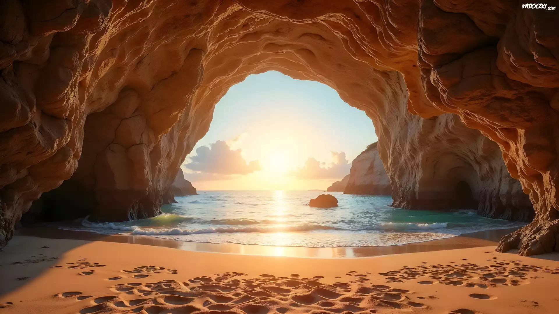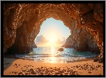 Morze, Jaskinia, Skały, Piasek, Zachód słońca