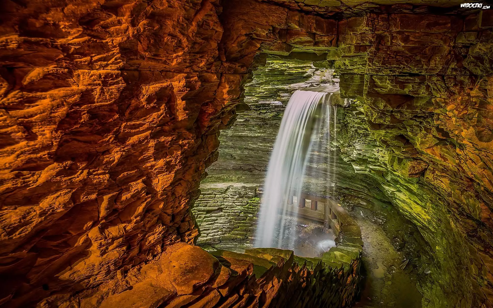 Wodospad, Drzewa, Rzeka Wodospad Jaskinia, Woda Wodospad Wodospad w lesie Liść, Jesień, Ławka Jesień, Jezioro, Ławka Jesienny, Las, Ławeczka Wodospad Lasek, Dróżka, Ławka Wodospad, skały Wodospad, Las Wodospad zimą Kaskada, Wodna, Drzewa