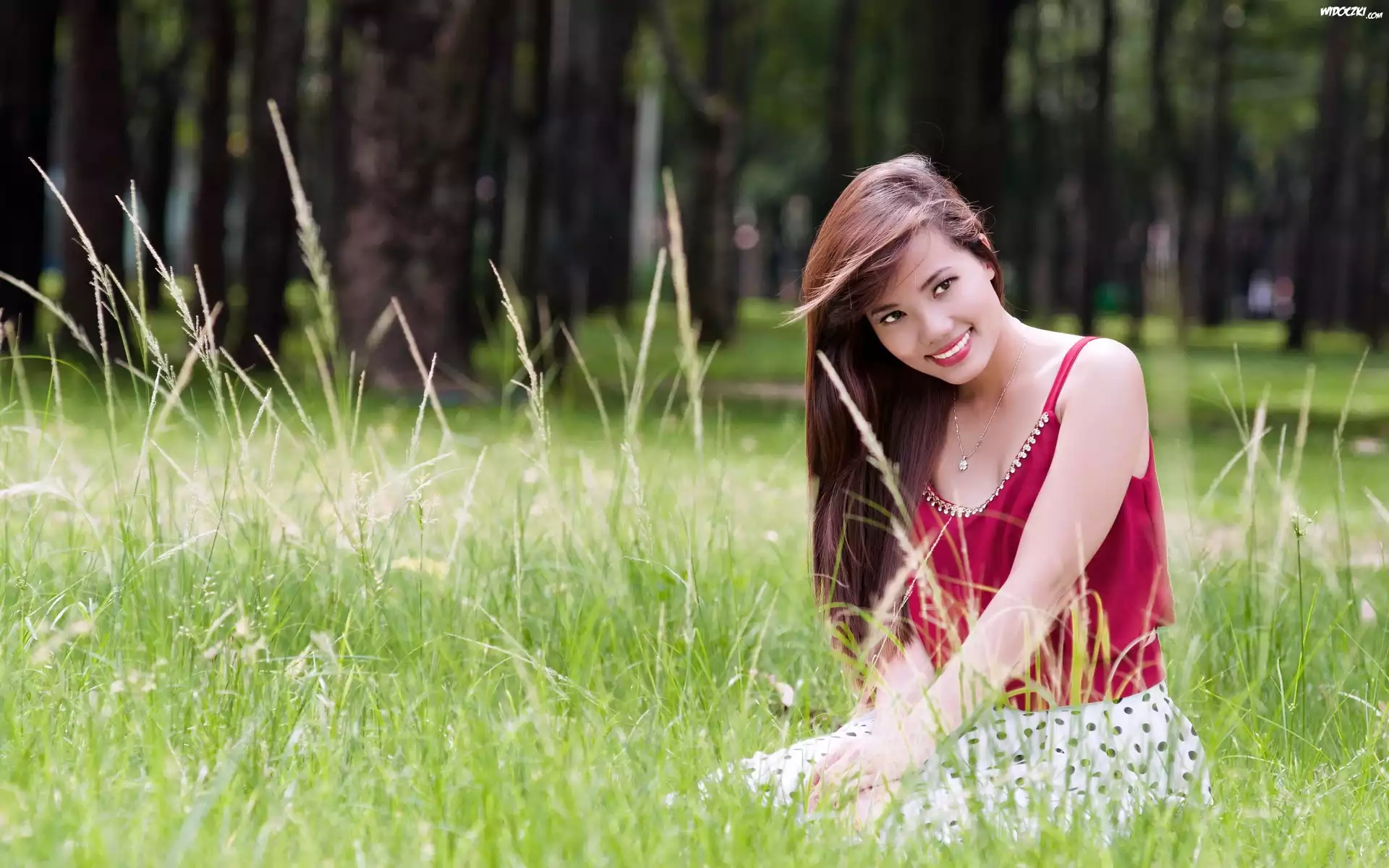 Piękna, Japoneczka, Makijaż, Łąka, Park