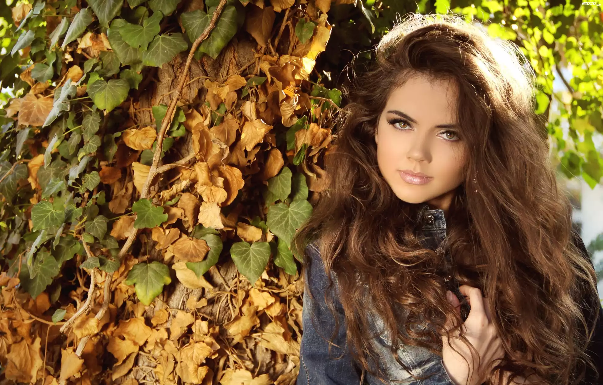 Piękna, Brunetka, Makijaż, Las, Liście, Jesień